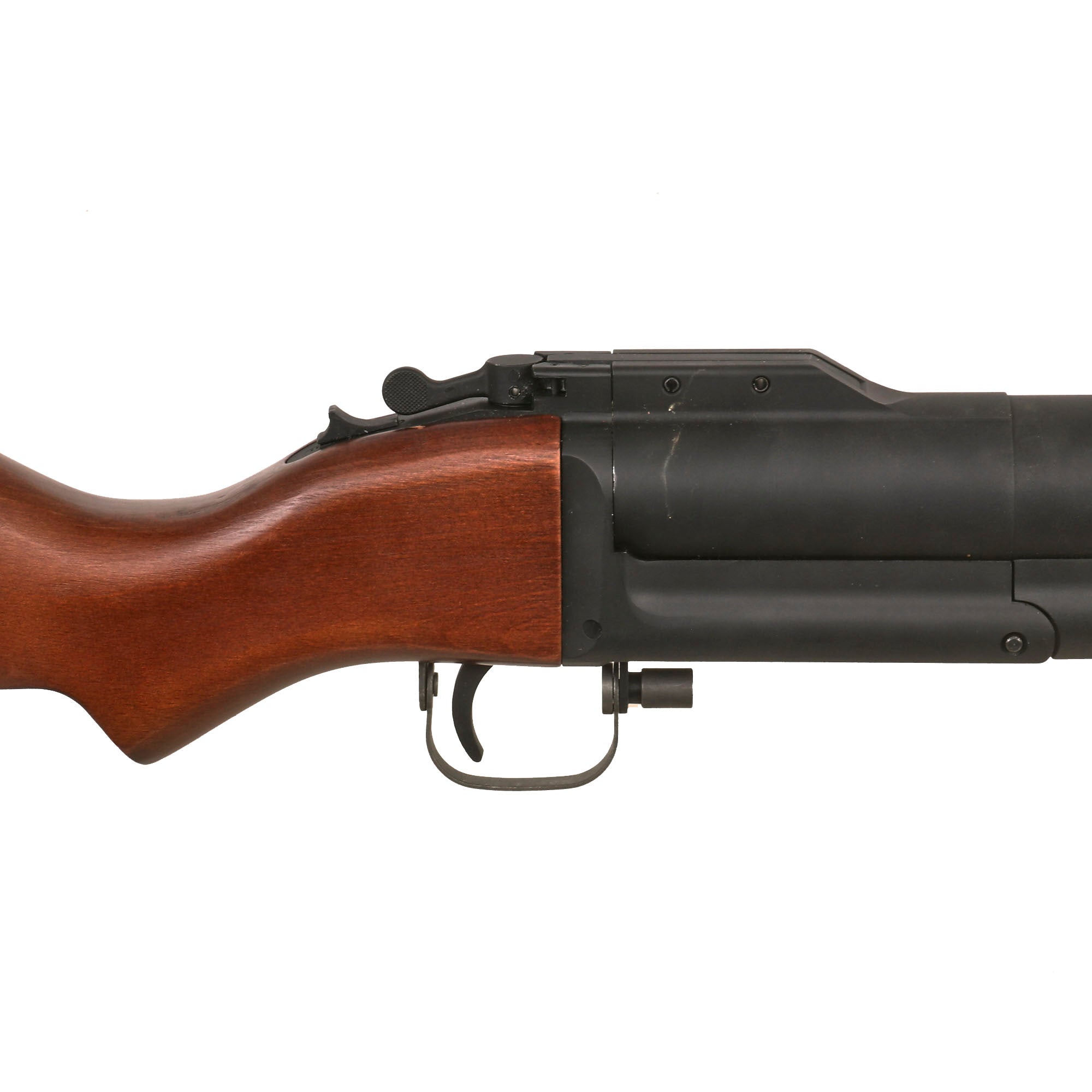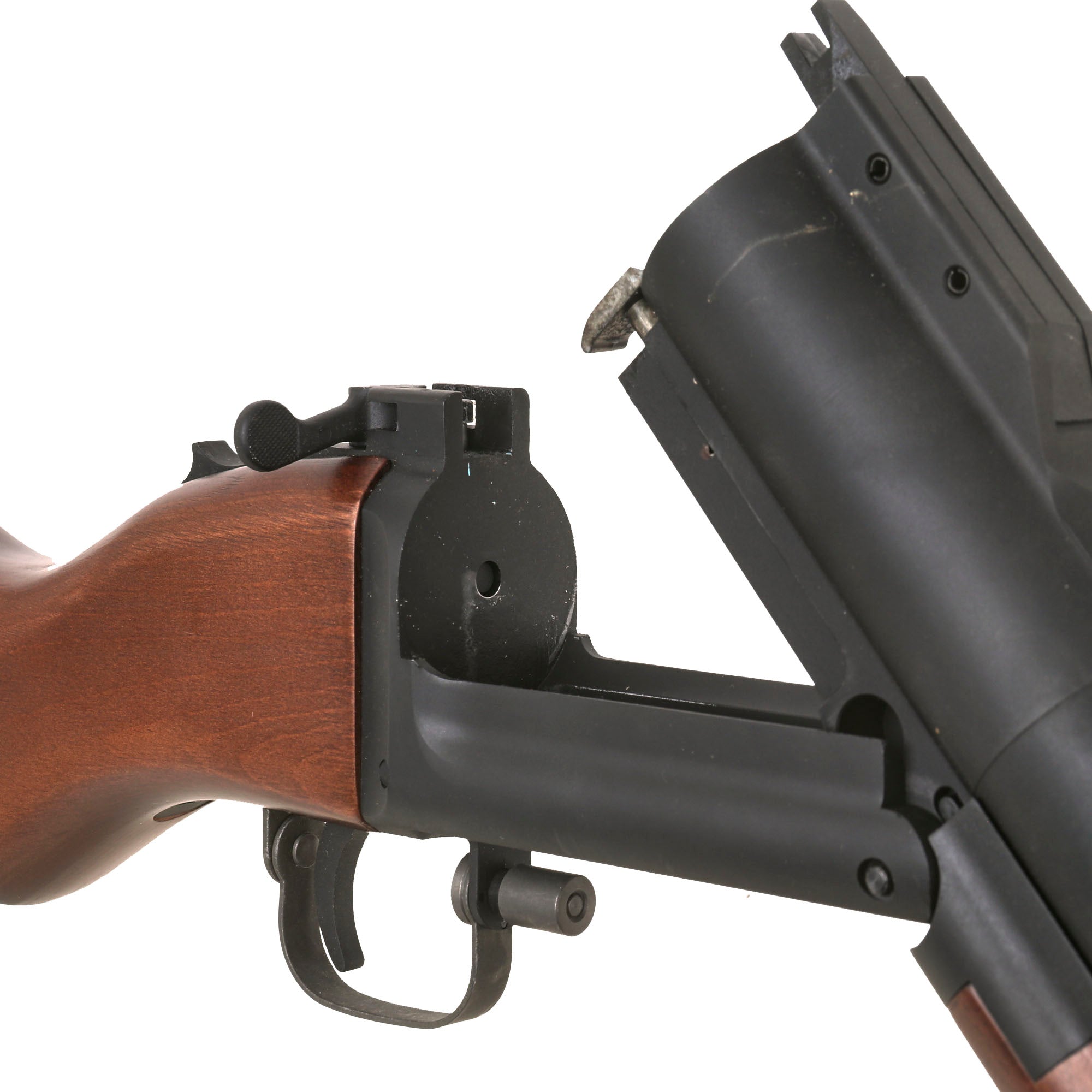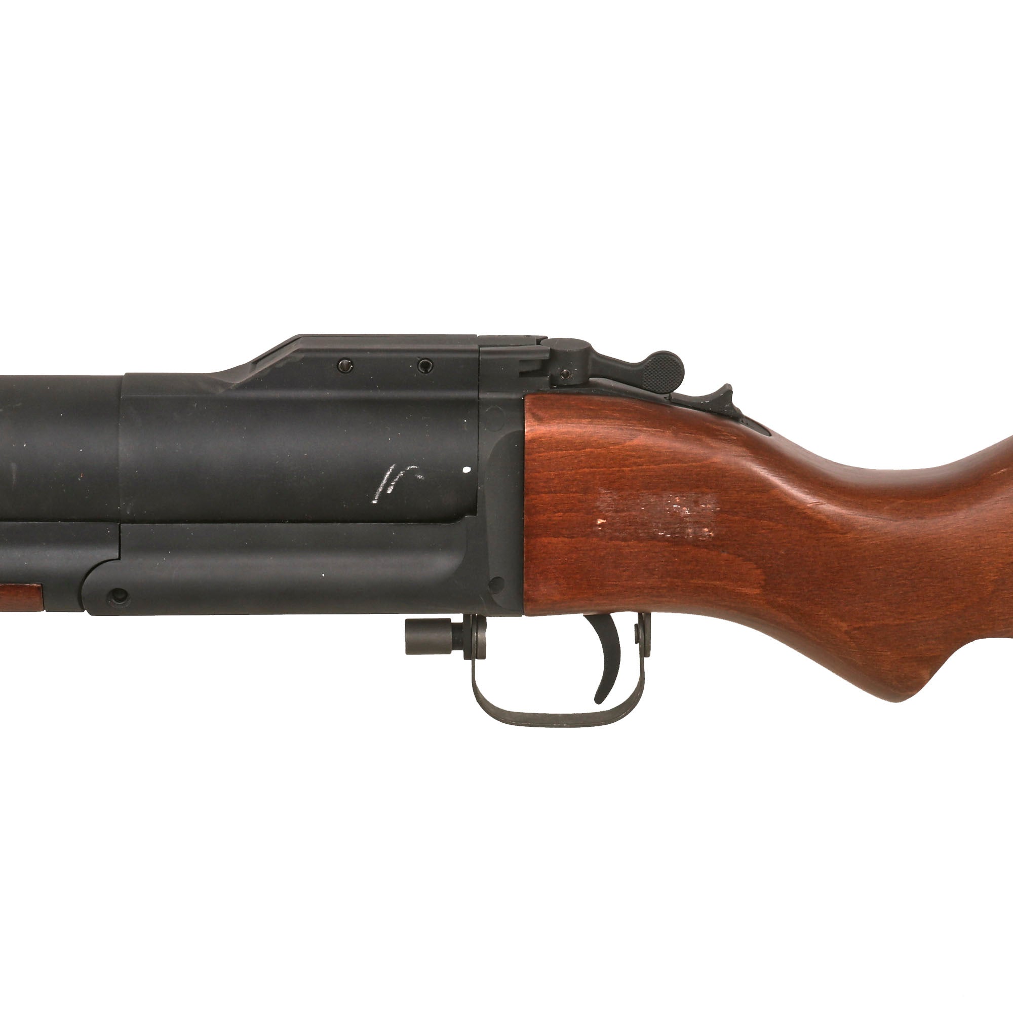 New Made Item: Inert and cannot be converted to a destructive device. Used but very good condition full size 1:1 scale replica of the M79 Grenade launcher used by American forces during the Vietnam War. This is a single-shot, shoulder-fired, break open grenade launcher fires an Airsoft 40mm gas grenade. The M79 can fire a wide variety of 40 mm rounds. This M79 grenade launcher is a full metal launcher with a real wood stock, which a rubber pad affixed to the shoulder stock to make it more supportive and comfortable when aiming. The trigger guard can be rotated either to the left or right side by pushing the button on the front of the trigger guard. This example comes with a bandoleer holding six dummy rounds, great for display.