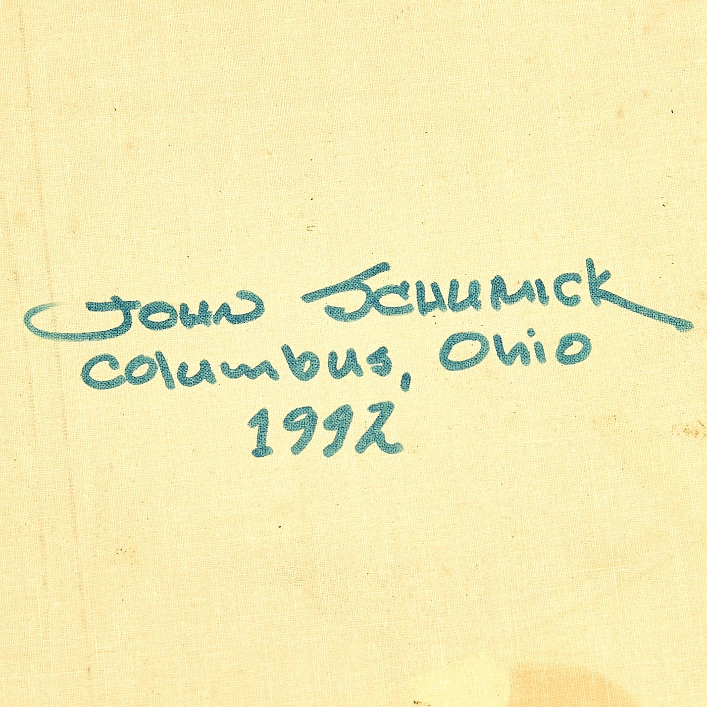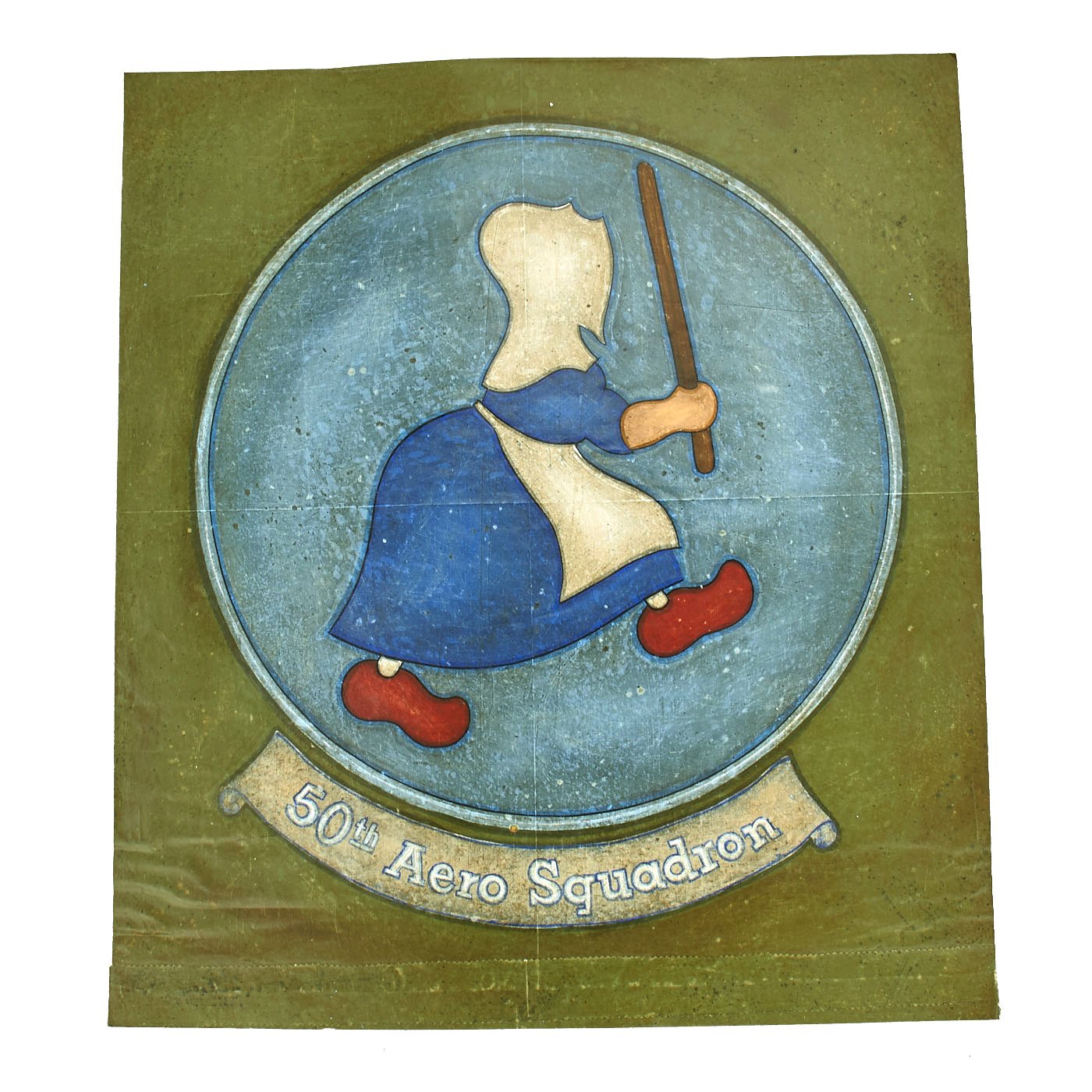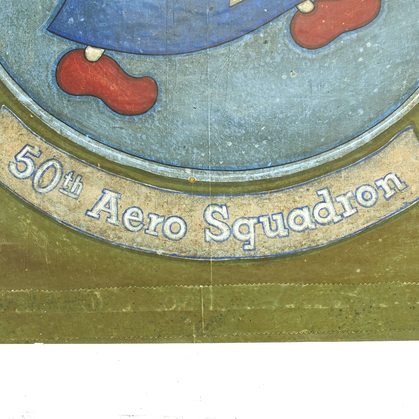 New Made Item: Beautiful hand painted Great War biplane Fuselage canvas panel painted and antiqued in 1992 by the late artist John Schumick, a WWII veteran from Columbus Ohio. The art features the insignia for the 50th Aero Squadron. The canvas measures 33.5" X 30" and is offered in excellent condition. It is signed on the reverse side by John Schumick and dated 1992.