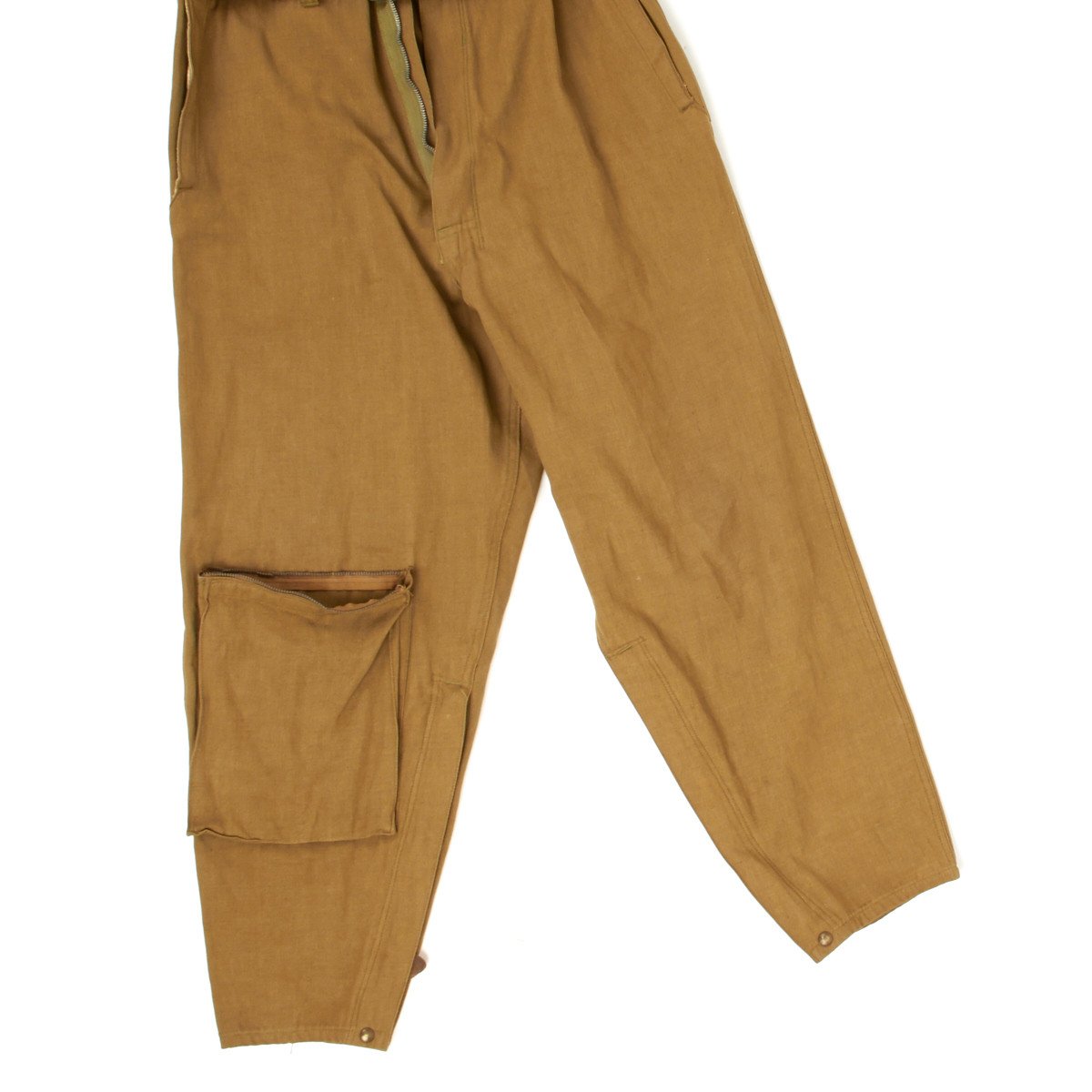 The design of the flight suit consisted of a khaki colored jump suit. With a zipper that secures the front shut. Additional zippers are placed at the bottom of the legs. This feature makes it easier to put on and take off the flying boots. A belt is permanently attached to the waist area. A metal buckle is provided.