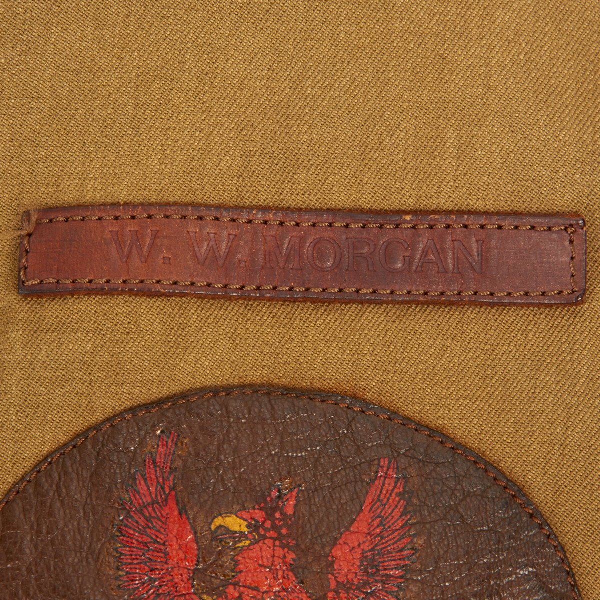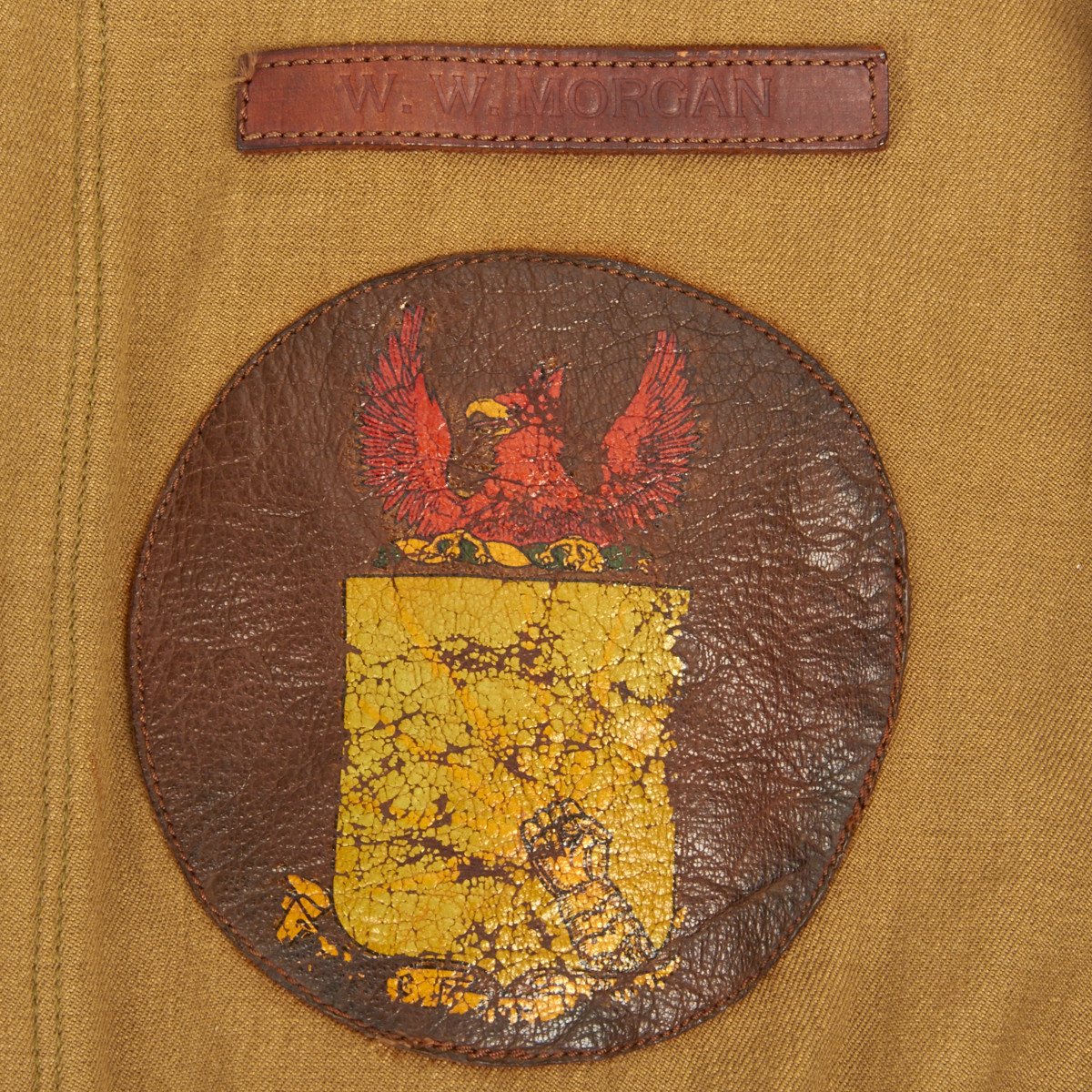 Original Item: Only One Available. This rare US Army Air Corps flight suit is in very good condition, all snaps and other zippers function perfectly with the exception of two broken zippers- main and left leg pouch. It features leather Lieutenant’s bars on the shoulders and is named to W. W. MORGAN on the leather patch above left breast squadron patch. Belt still present, cuff and leg zippers function perfectly.