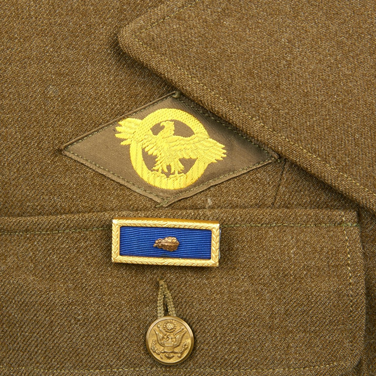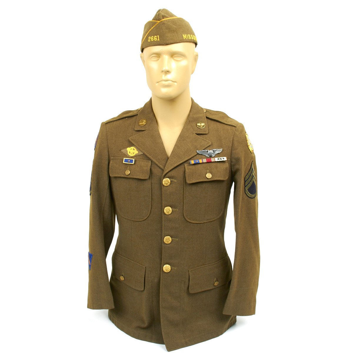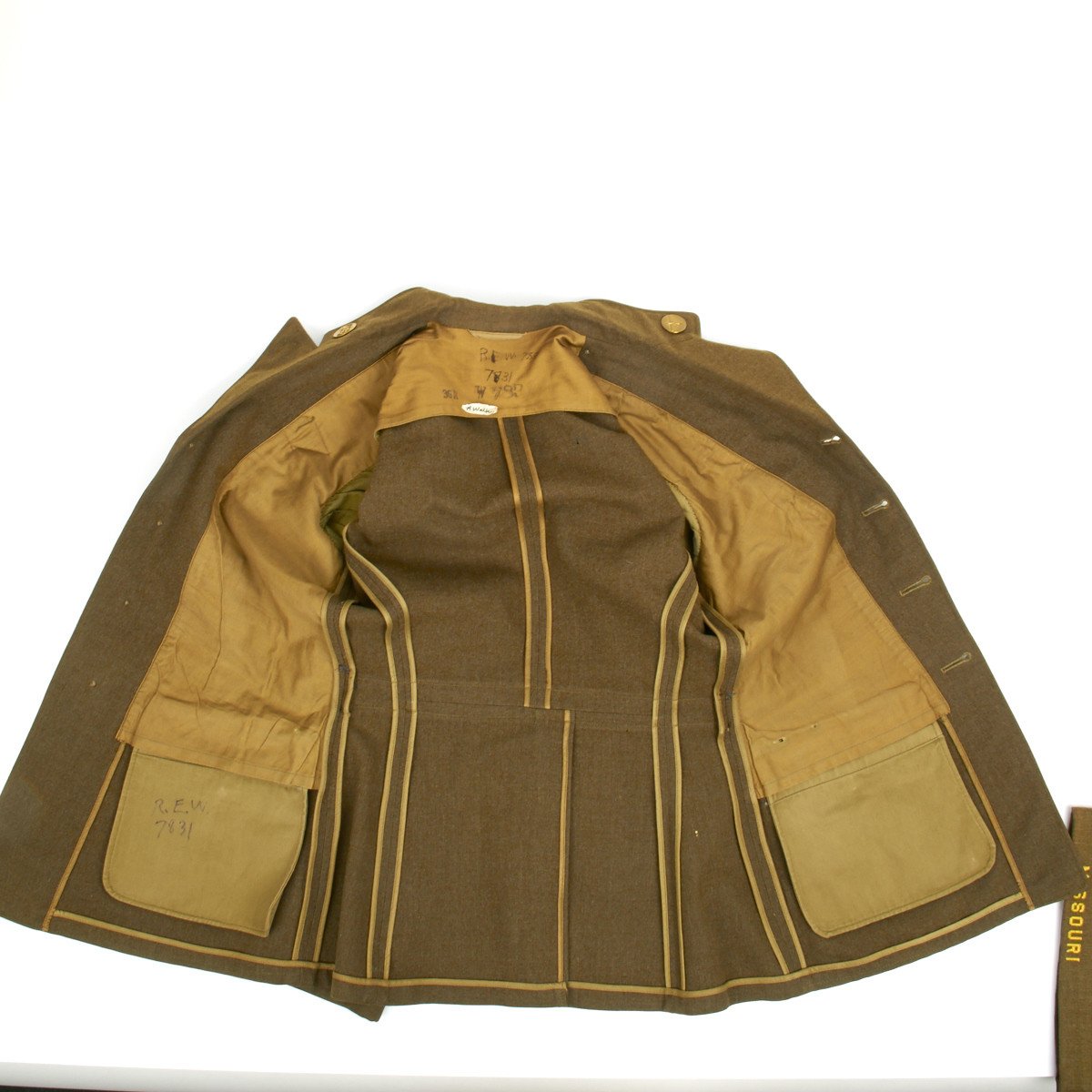 Corporal Ryan Walkers 1942 dated tunic with his initials and number (R.E.W. 7831) complete with all buttons, insignias, badges including his post WW2 Veterans of Foreign Wars shoulder patch. Much information including the 1942 date to be found in the original government tag in the internal right breast pocket.