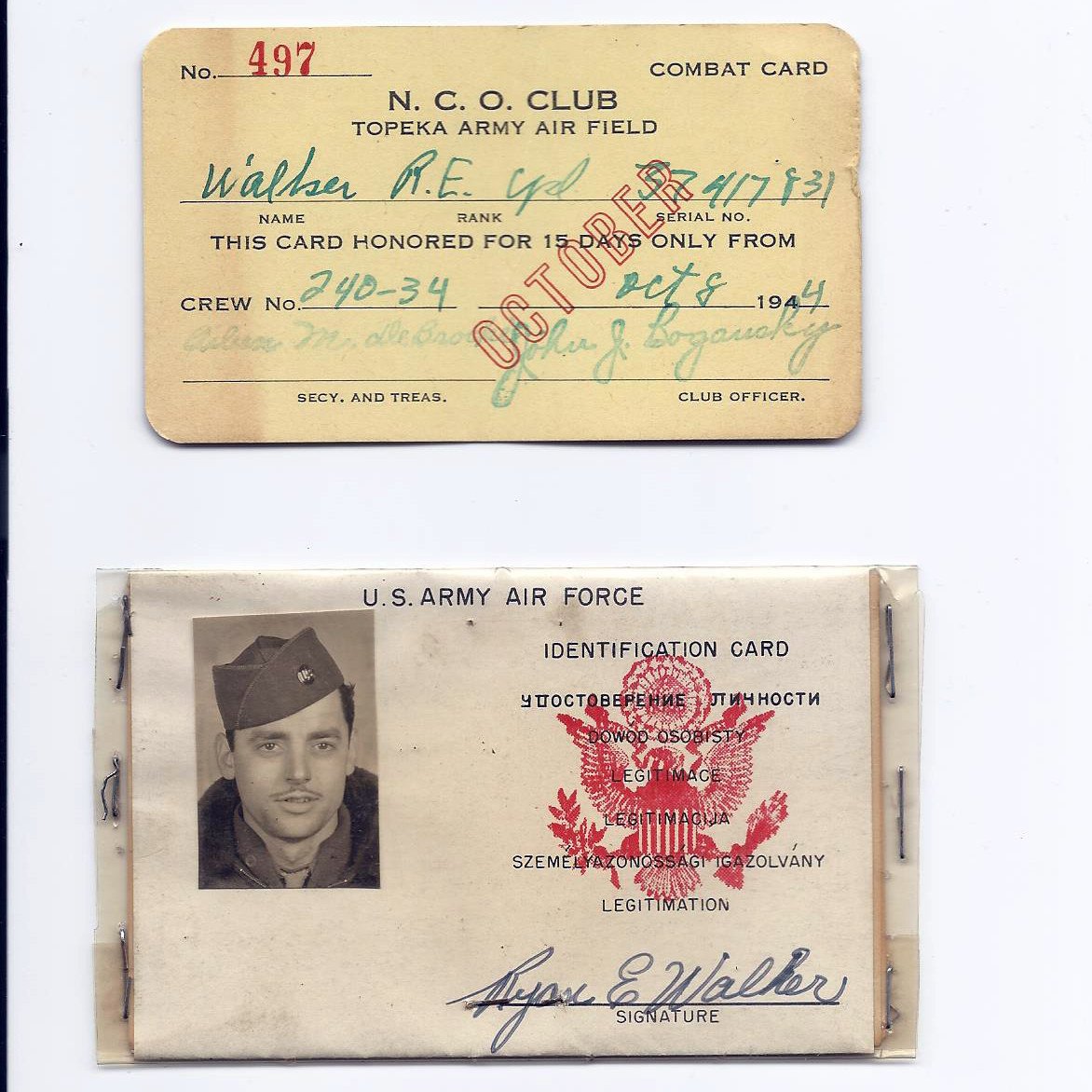 1944 dated N.C.O. CLUB CARD to the TOPEKA ARMY AIRFIELD branch valid for OCTOBER 1943.