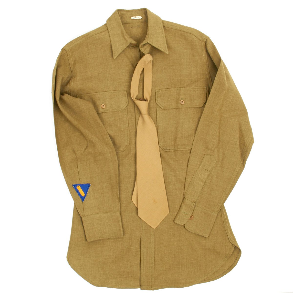 Khaki shirt with his name pinned in the rear together with his tie, also named.