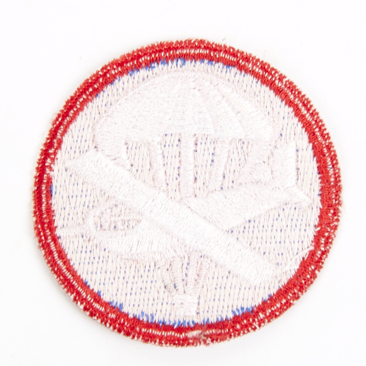 New Made Item: High quality heavily embroidered U.S. WW2 Paratrooper badge as worn by the 101st and 82nd Airborne and glider troops. Placed on the standard issues USGI wool overseas cap, worn on the right side by officers, and the left side by enlisted men. Patch features sky blue background with red outer circle and white parachute with glider.