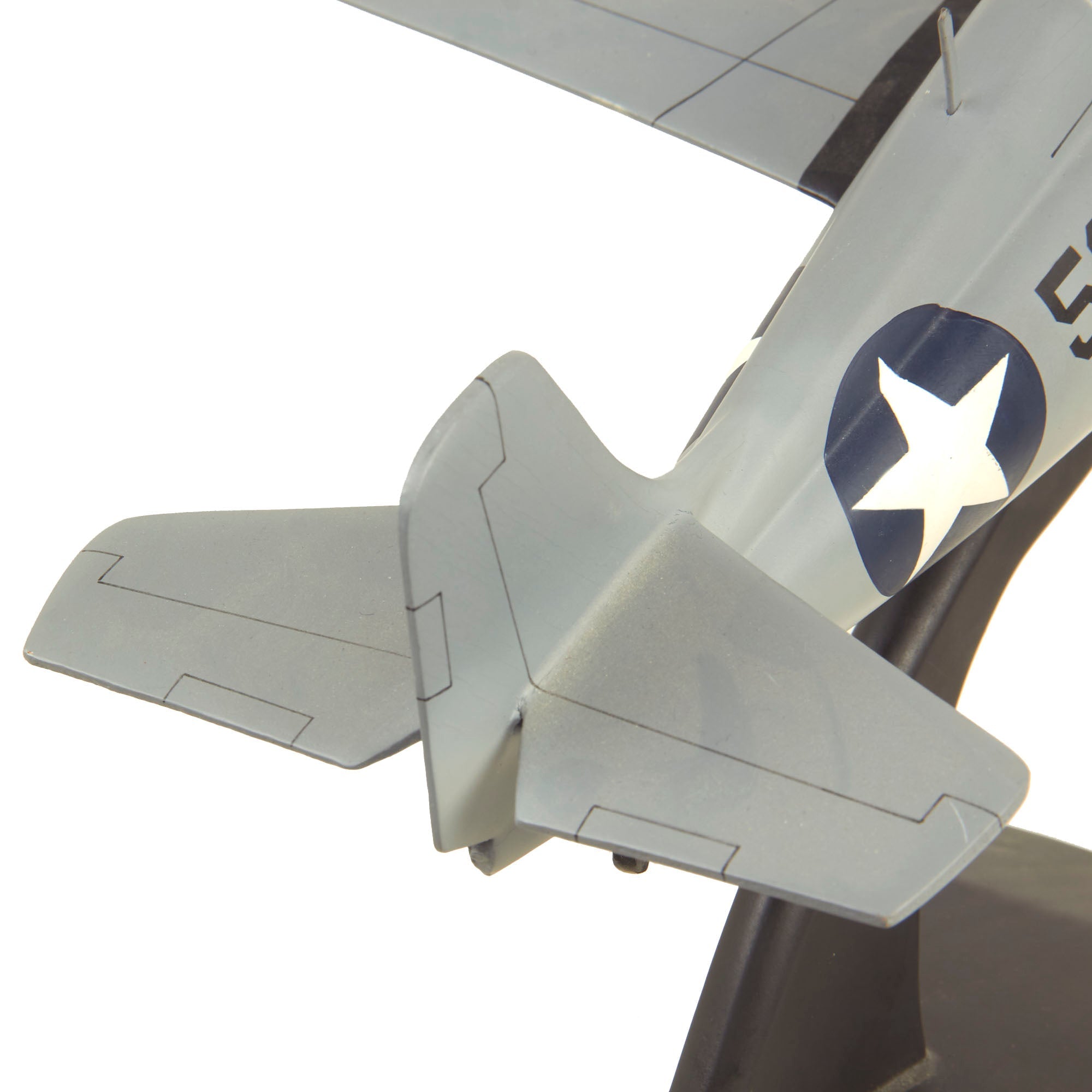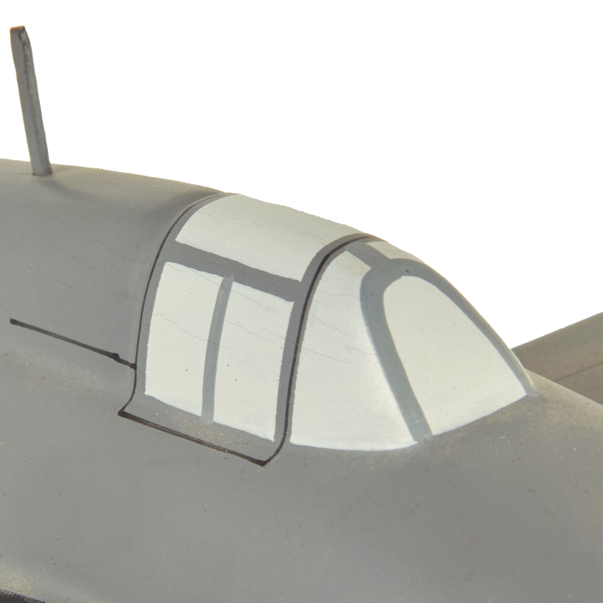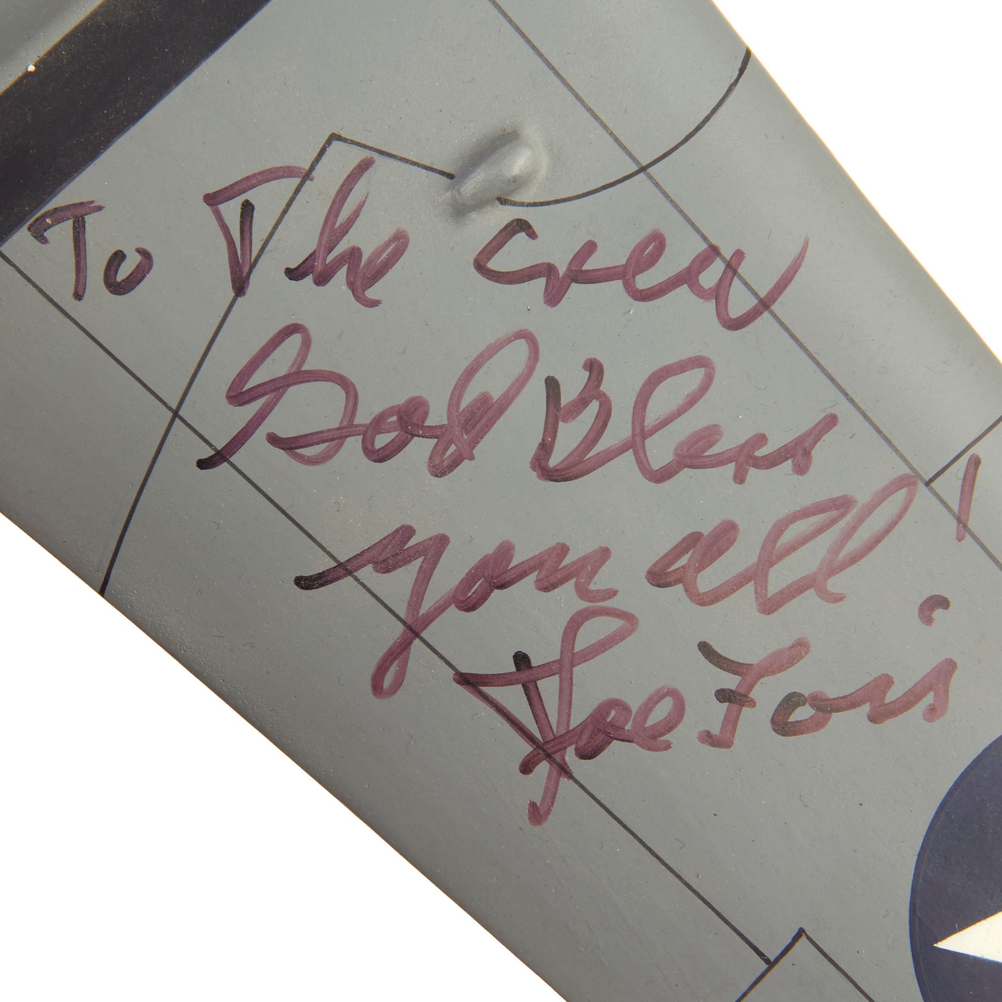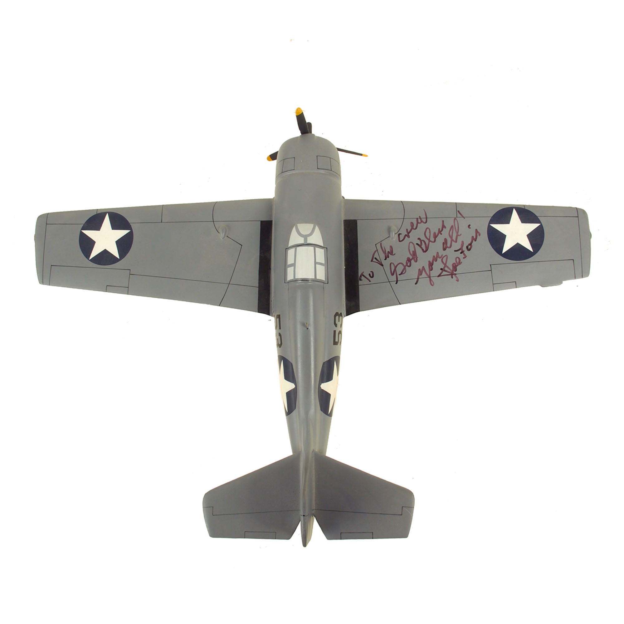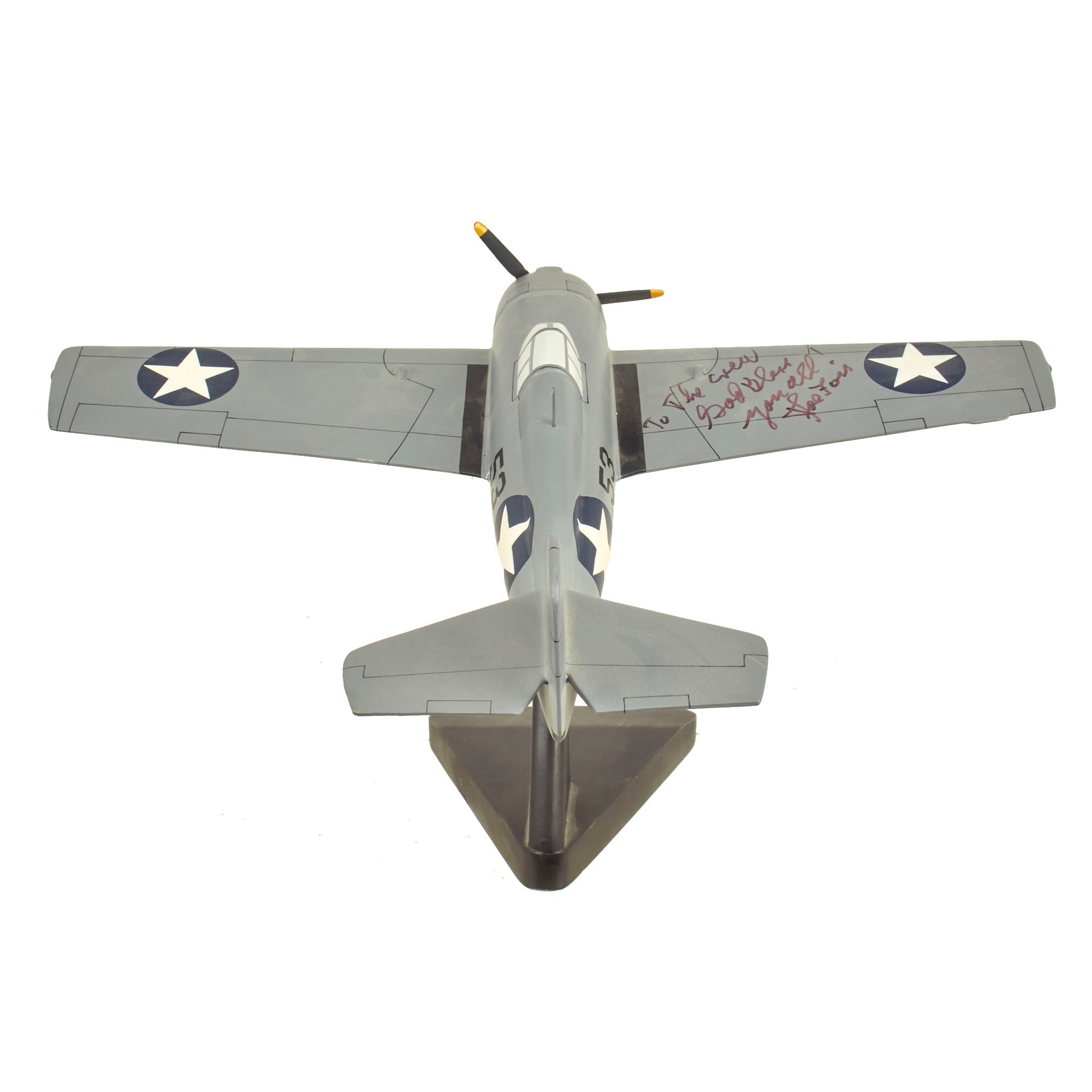 This model measures approximately 18” x 13” and stands at 10” tall. The right wing is signed by Flying Ace Joe Foss. Included with the model is a new made fighter squadron patch.