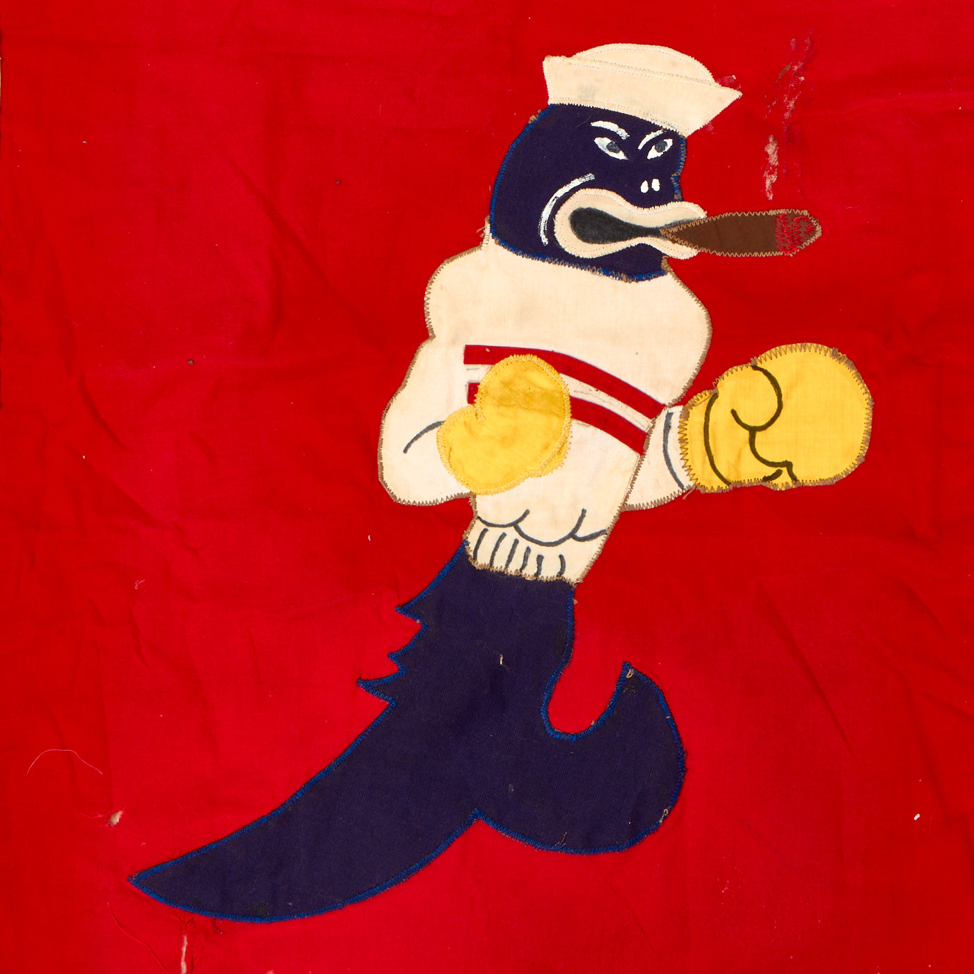 The tradition of submarine battle flags began during WWII when subs returning from patrol would fly flags representing ships sunk, total tonnage, or a broom indicating a “clean sweep” (meaning that every target engaged was destroyed). Toward the end of the war the crews started making flags specific to their boat with a logo and sewn patches indicating ships sunk, the number of patrols, pilots rescued, citations received, etc.