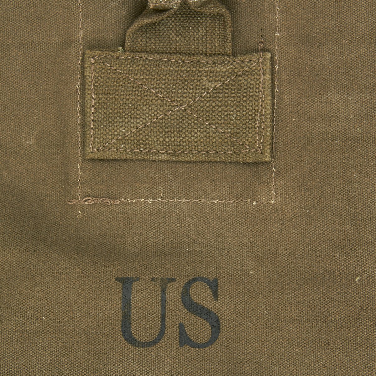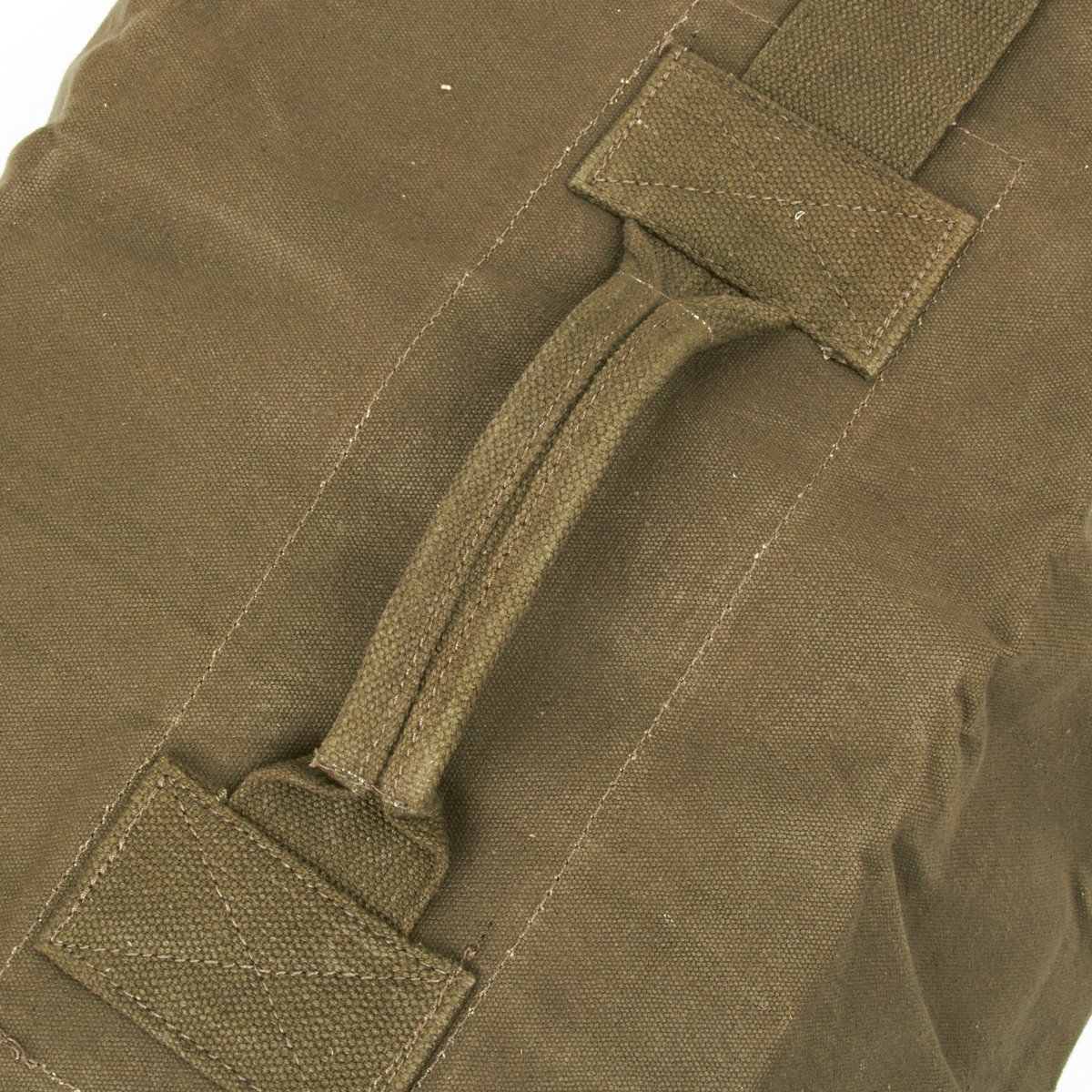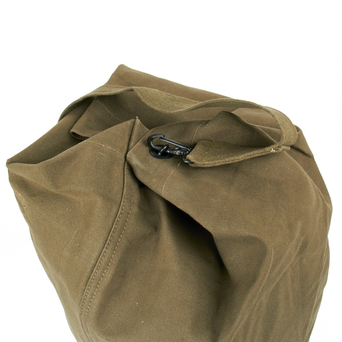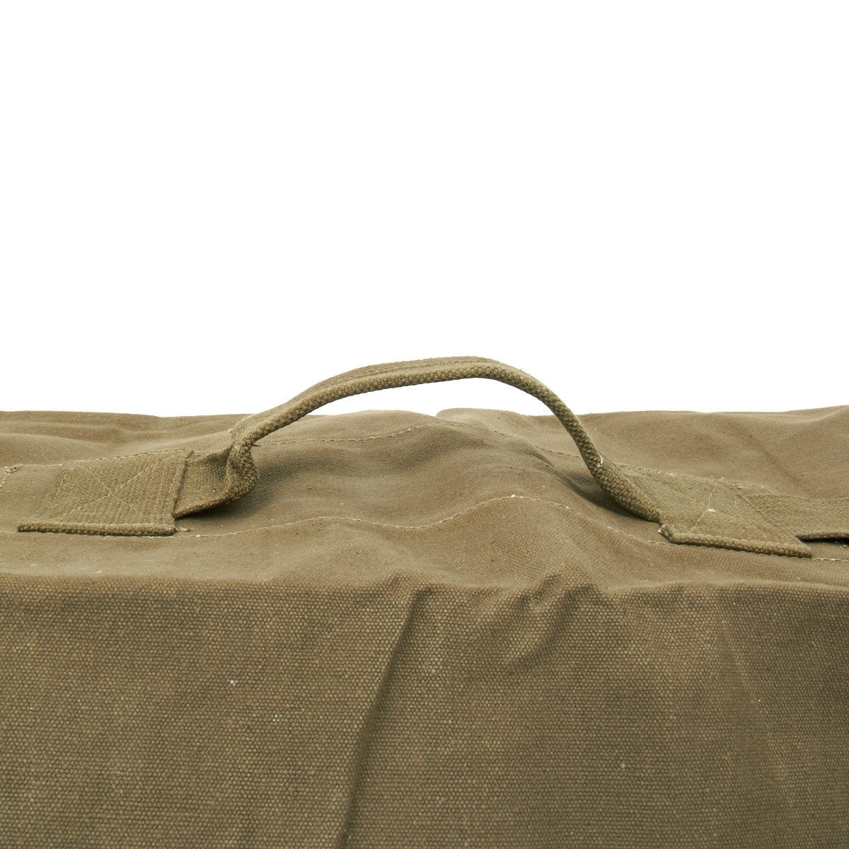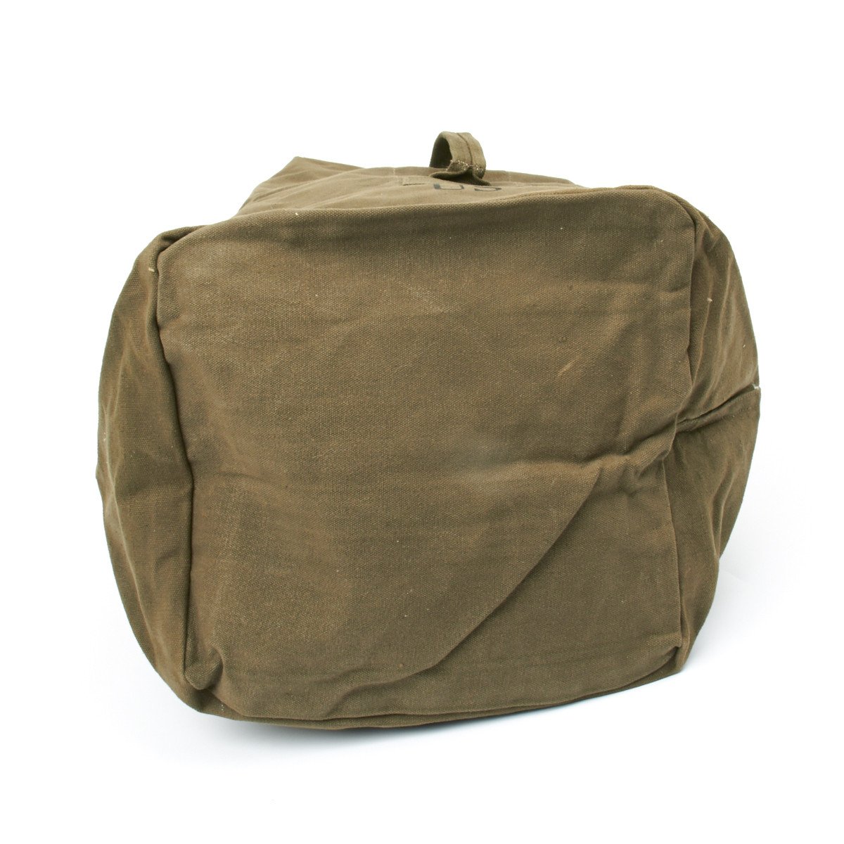 Original Item: This is an outstanding rugged reproduction of the WW2 duffle bag constructed of OD #7 (darker than OD #3 indicating late war production) canvas with period correct heavy-duty web shoulder strap and carry handle. Top quality seams are correctly double needle felled, mirroring the construction of originals adding to overall durability. This is a near exact copy of the original and truly top quality!