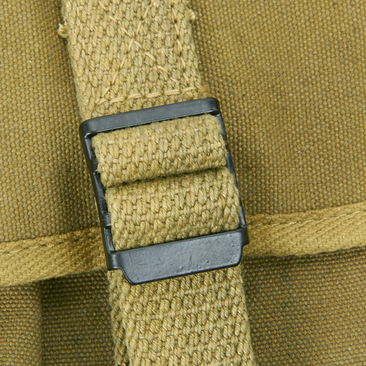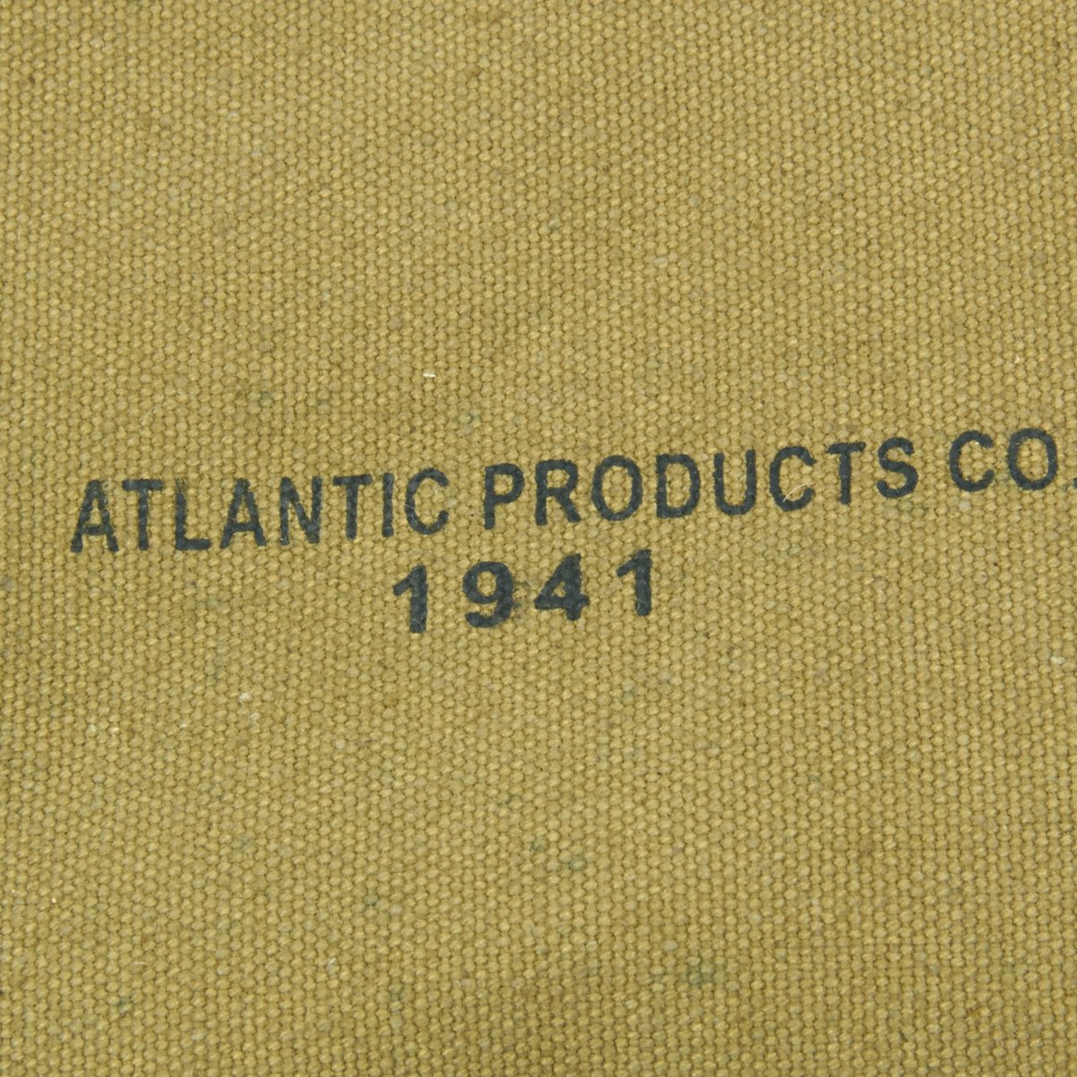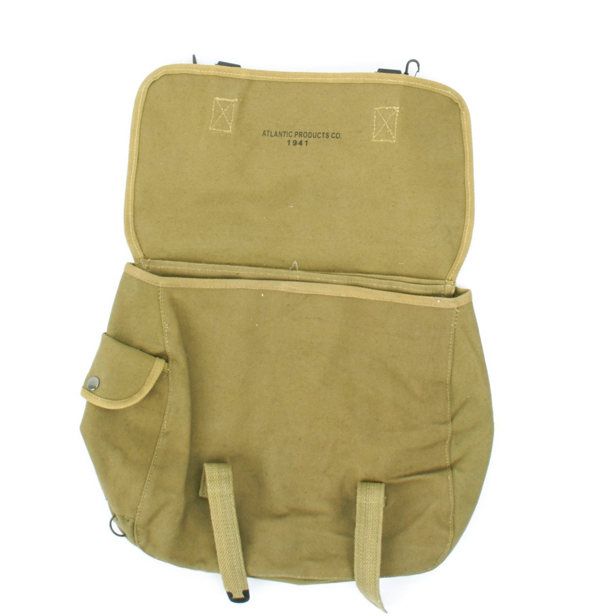 Our bag is high quality heavy cotton canvas construction with heavy cotton web straps and black steel hardware. It is marked U.S. on the outer front flap, and for added authenticity the interior is stamped with a 1941 date and a WWII manufacturer name.