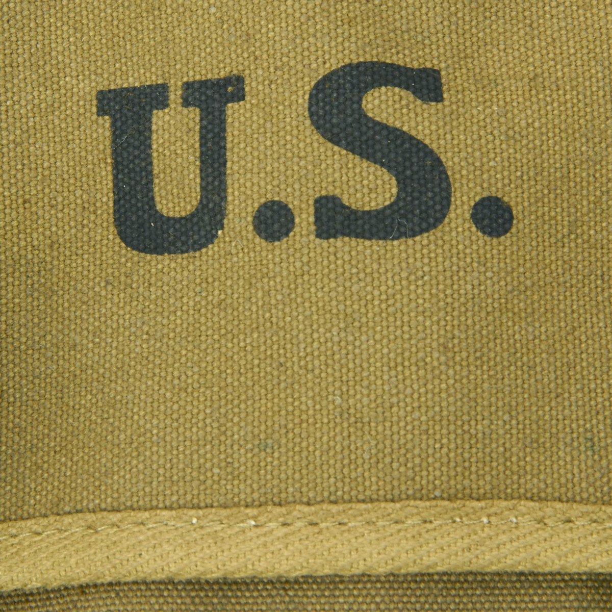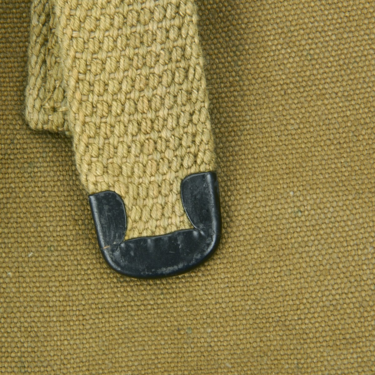 The Musette Bag has a rear flap pocket with a snap closure, and a left side cargo pocket, also with a snap. The interior was sectioned into compartments. It was very common to see different colors used in the bag itself and the web straps as wartime production was often not able to coordinate the transition from khaki to olive drab. Most had "US" stamped on the flap with the manufacturer and date on the back panel. The equipment tab with eyelets was added later in production and is not present on early bags.