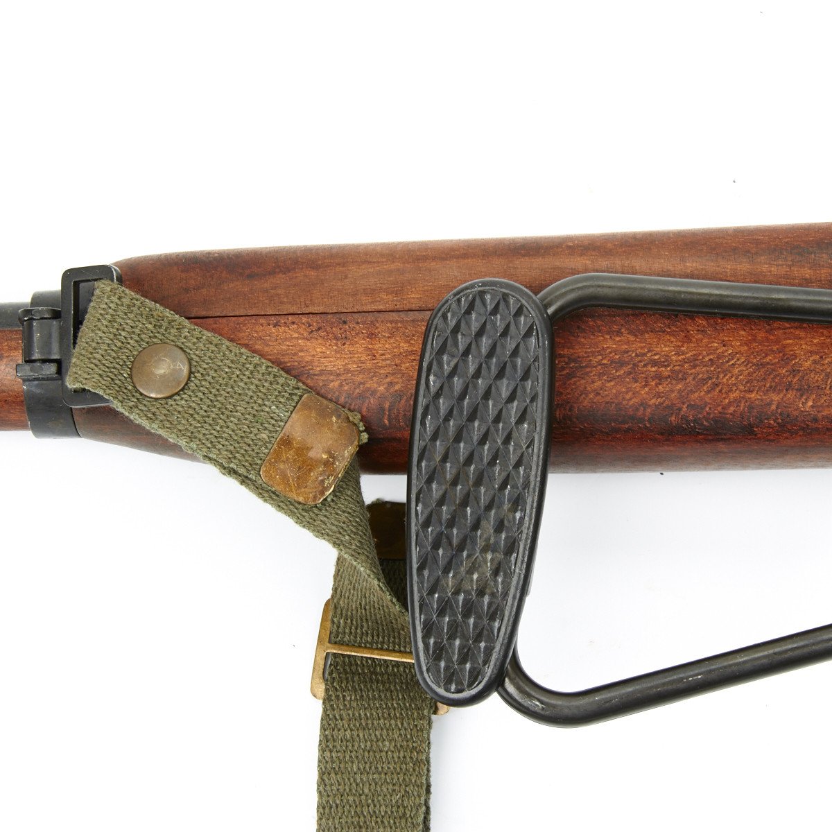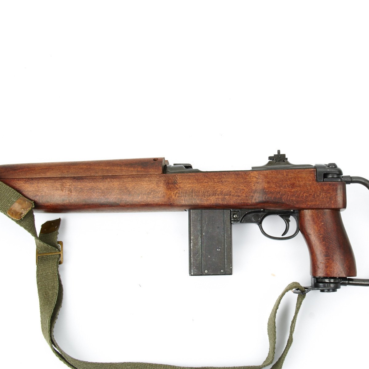 IMA is proud to offer a full sized 1: 1 scale completely non-firing dummy M1A1 Carbine display rifle. This is the finest replica on the market today. It looks and feels are just like an original. Stock made from hard wood with sturdy metal (zinc) functional parts, the action functions (nothing can be chambered, clip is non-functional and hollow) and the cocked trigger gives a satisfying "snap". The wire stock folds and extends and the butt plates folds flat. NOTE: OD Cotton Sling is pictured for illustrative purposes only, and is not included.