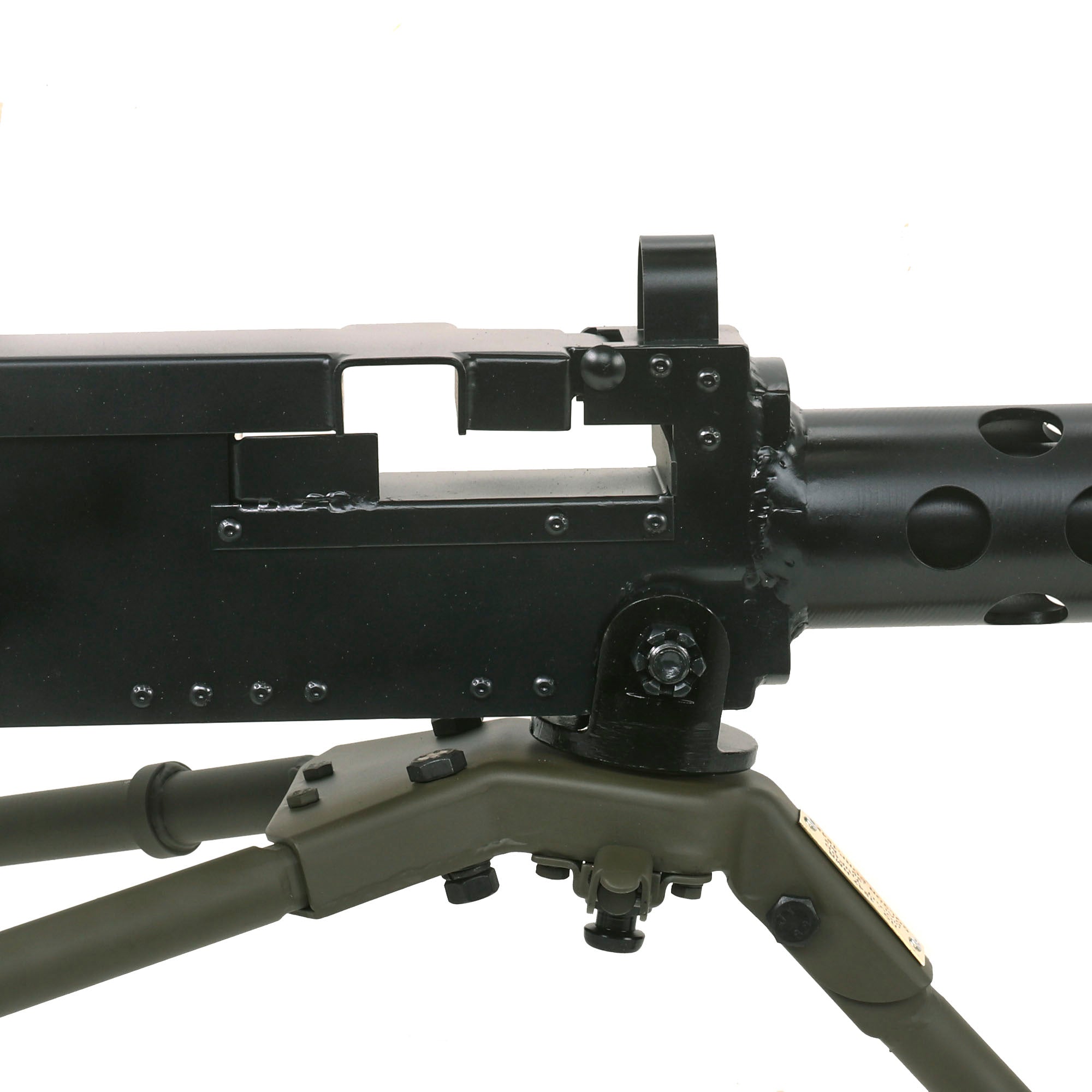 Custom Made Replica Item: Only One Available. This is a fine totally inert non-firing .50 cal M2 MG, custom fabricated manufactured from steel, with a few aluminum components. It is a full size 1:1 ratio replica. This is a 100% from the ground up fabrication, and no parts are compatible with a real .50cal. This display cannot be made to chamber nor fire a round, and has no internal components. The top cover does open, held closed by latch on the side, and the cocking handle can be moved back and forth, with an internal spring pulling it forward.