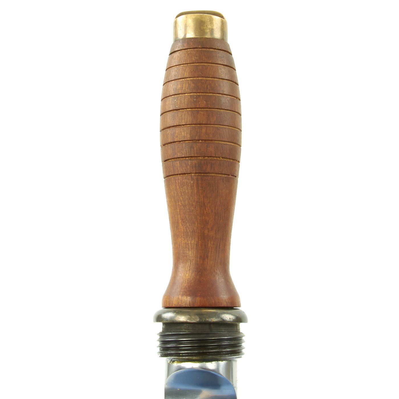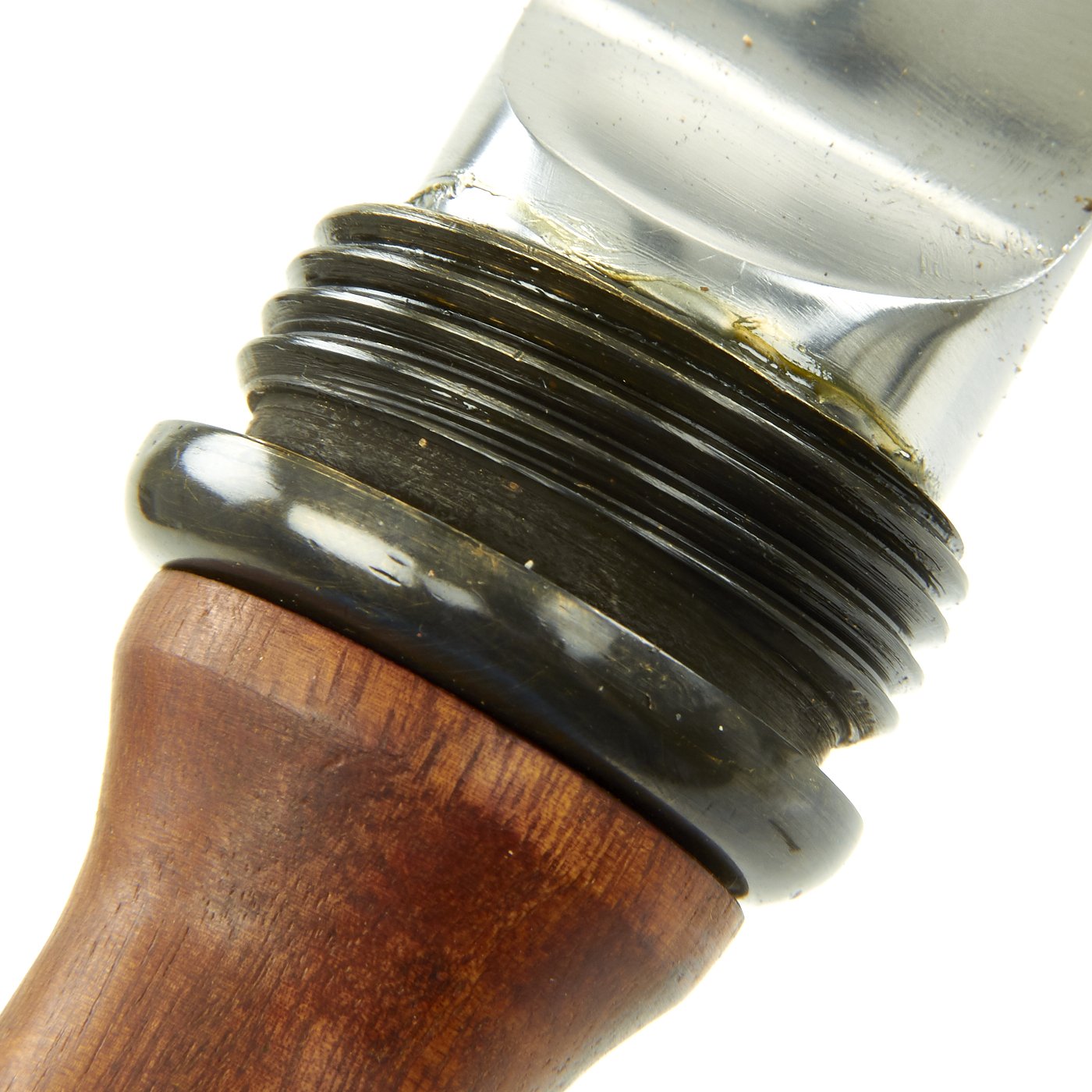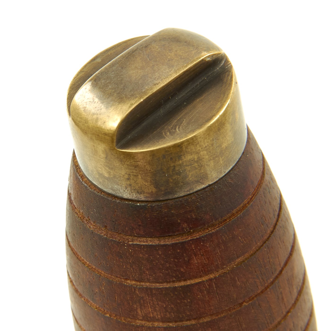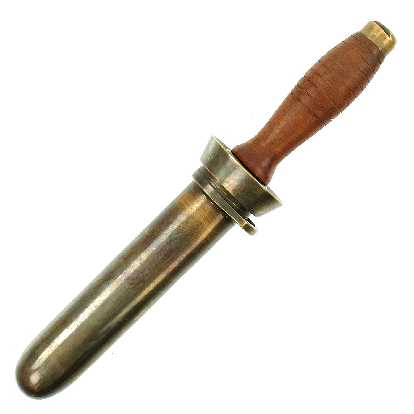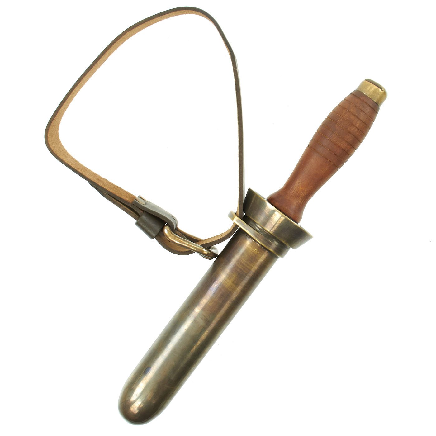 Features a high carbon steel 6 7/8 blade with saw teeth on one edge. The grip is turned hardwood and the hilt has a brass pommel, and the knife screws into a heavy solid brass cylindrical scabbard. Also included is an accurate reproduction leather belt with buckle.