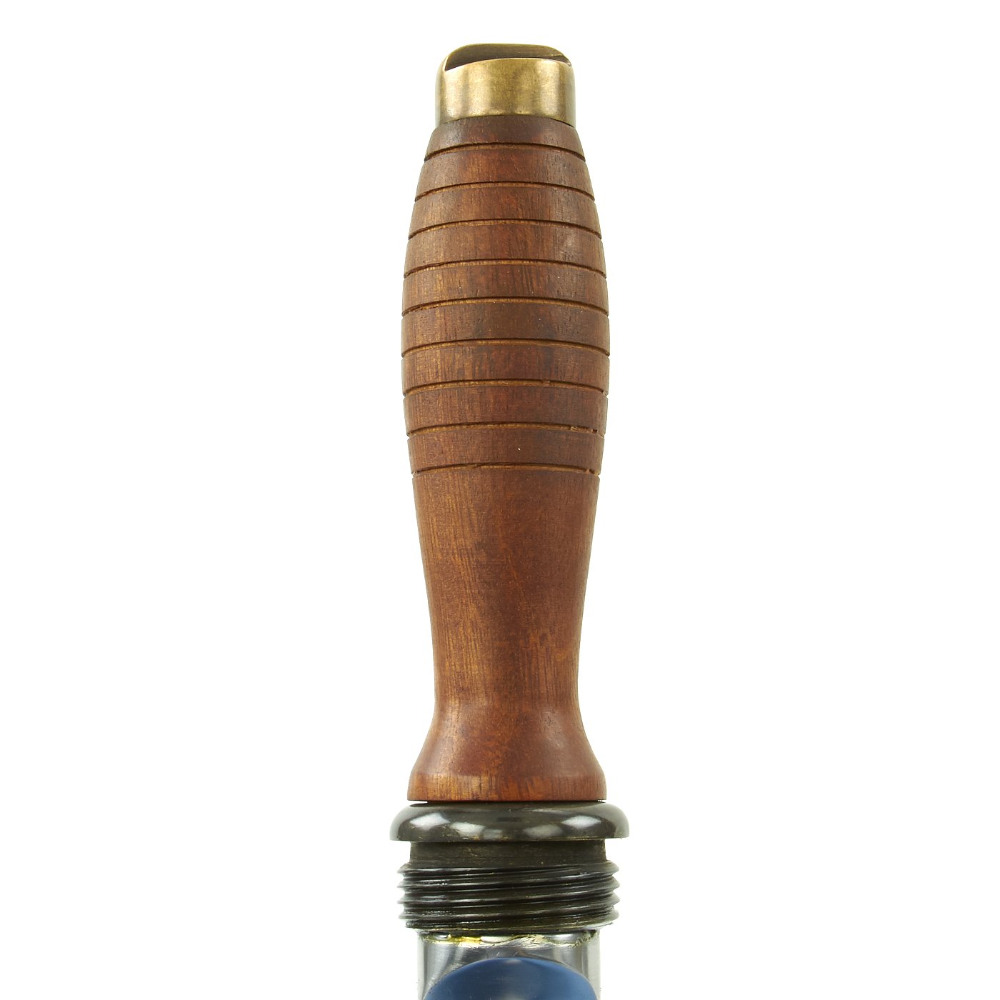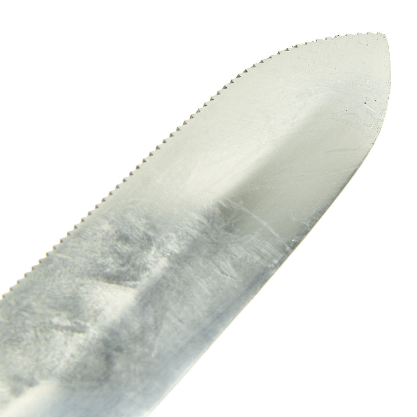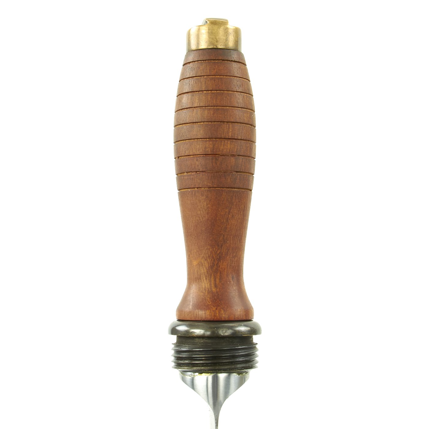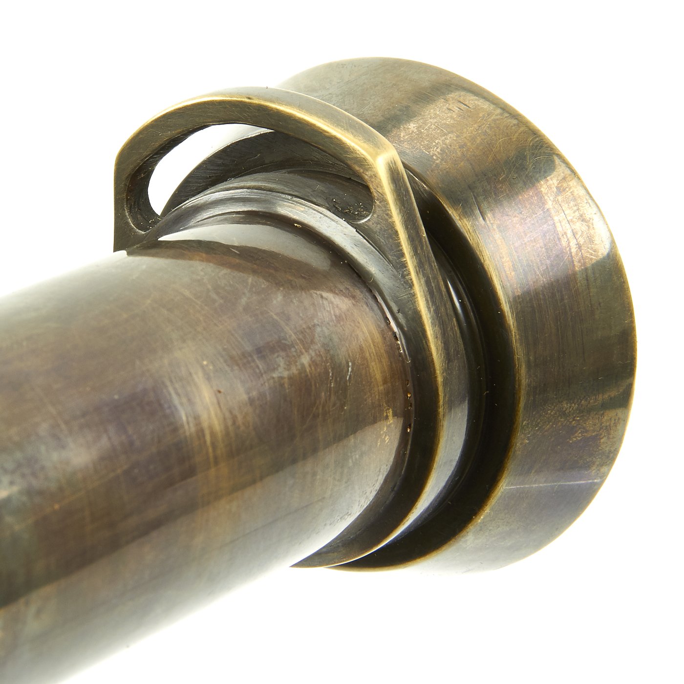 Features a high carbon steel 6 7/8 blade with saw teeth on one edge. The grip is turned hardwood and the hilt has a brass pommel, and the knife screws into a heavy solid brass cylindrical scabbard. Also included is an accurate reproduction leather belt with buckle.