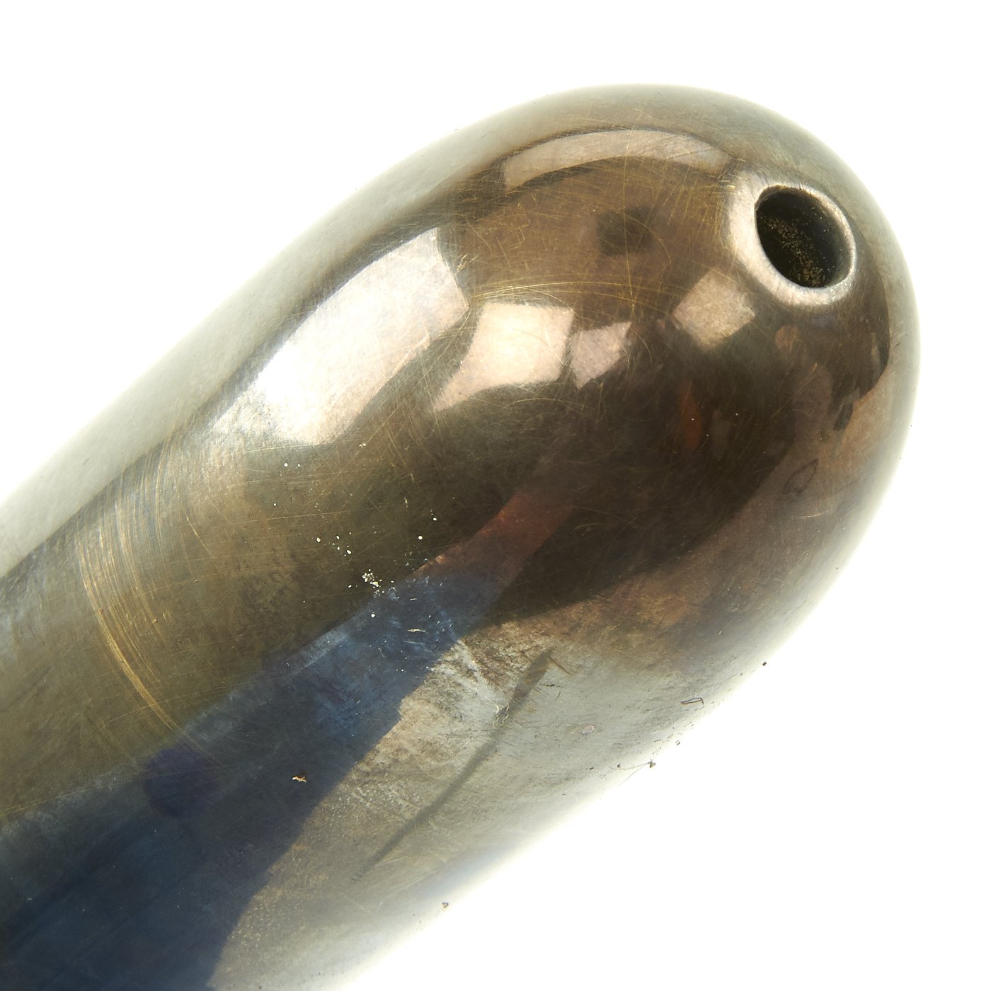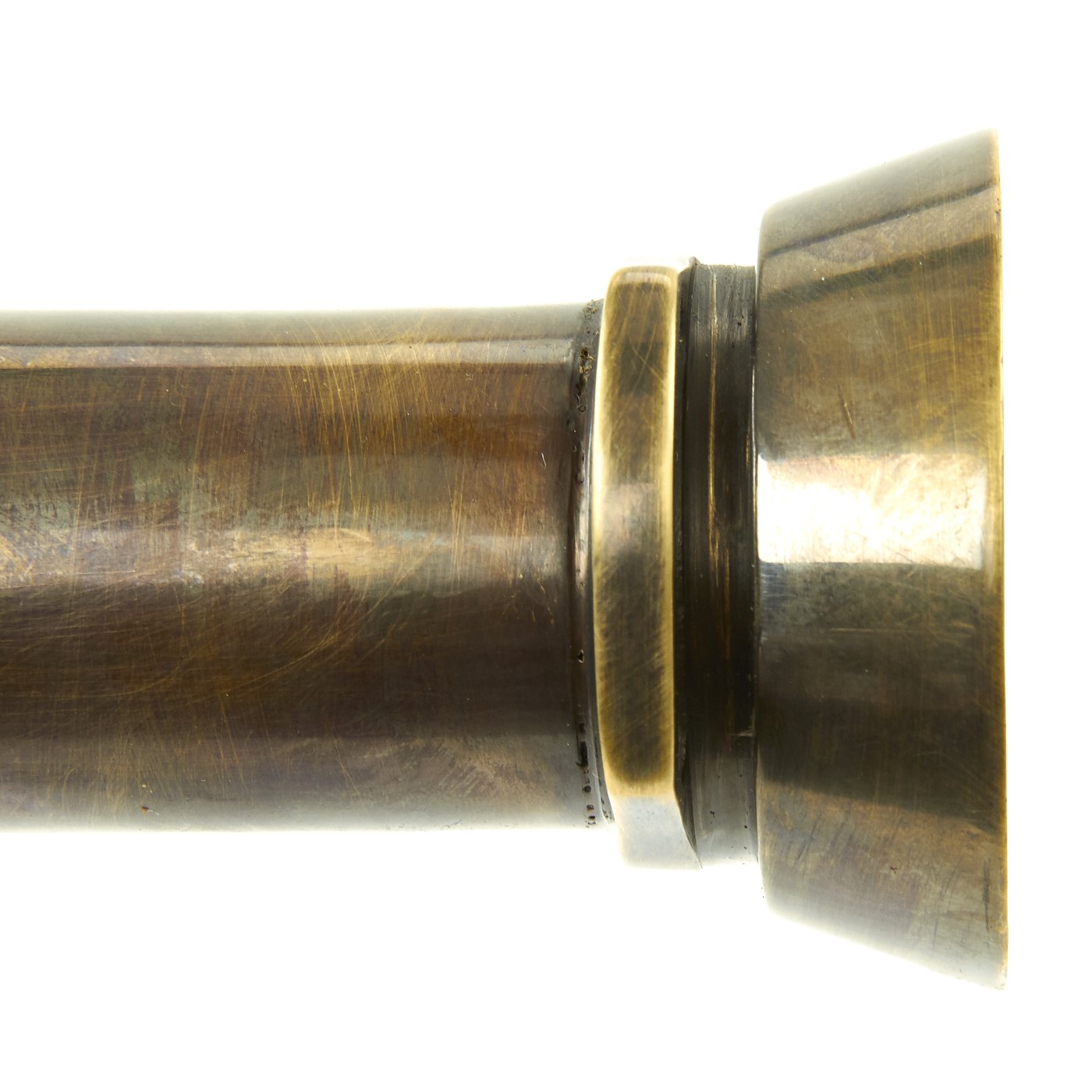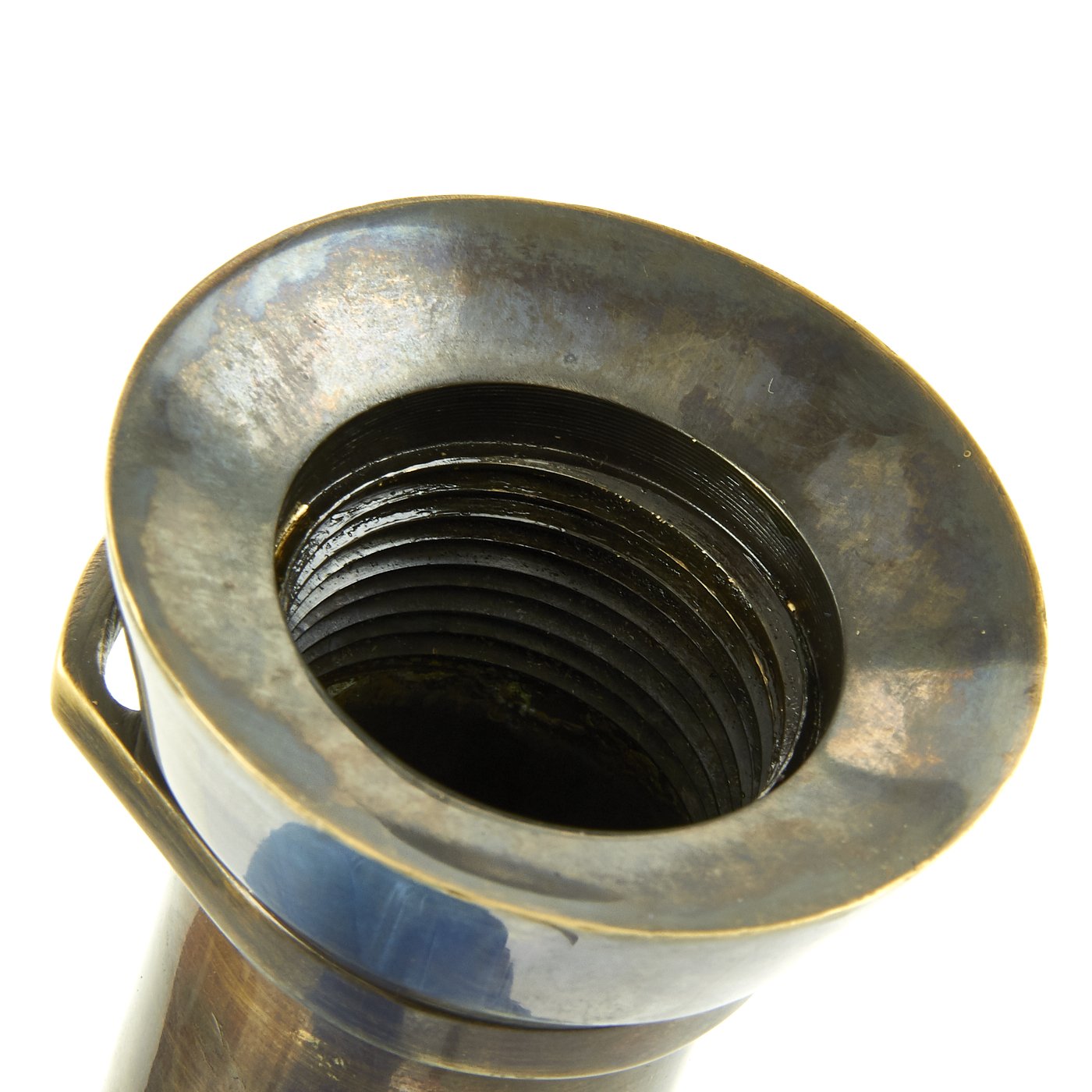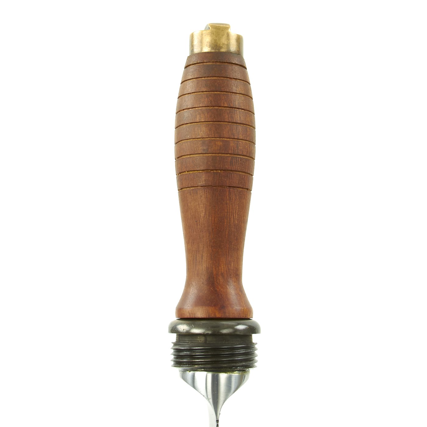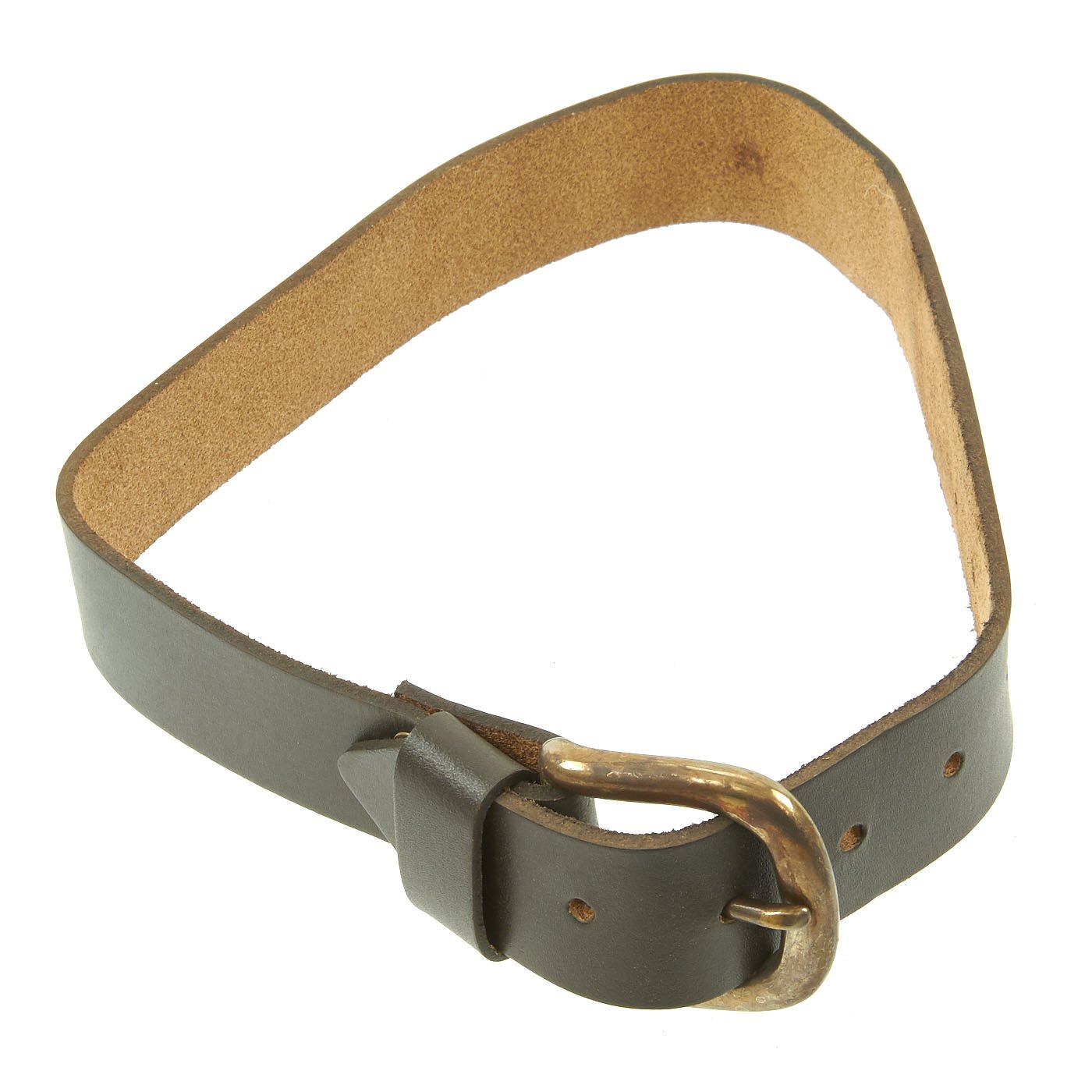 Features a high carbon steel 6 7/8 blade with saw teeth on one edge. The grip is turned hardwood and the hilt has a brass pommel, and the knife screws into a heavy solid brass cylindrical scabbard. Also included is an accurate reproduction leather belt with buckle.