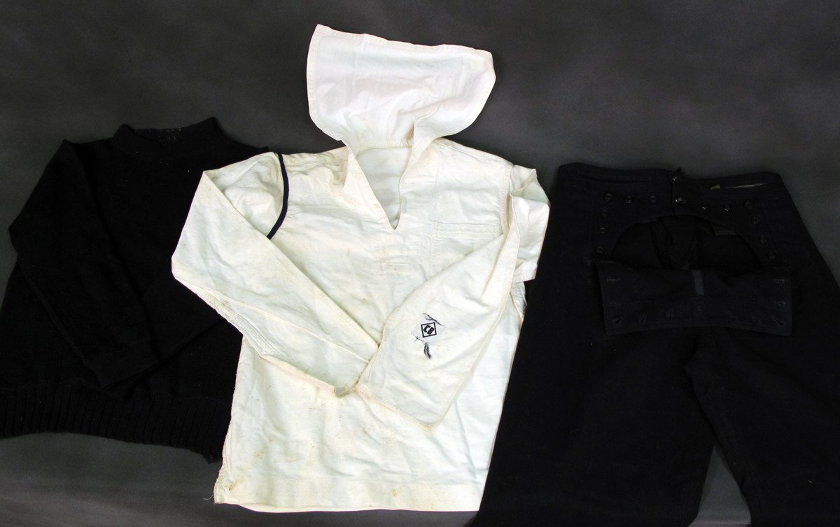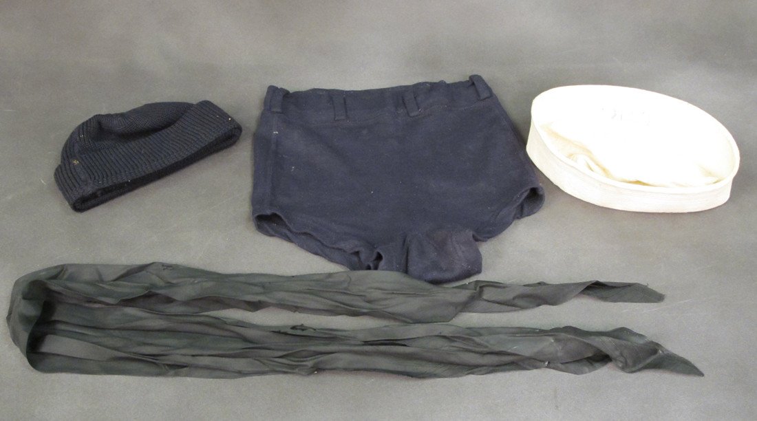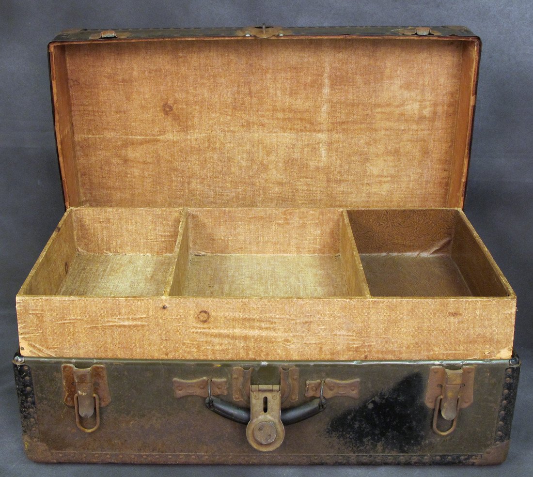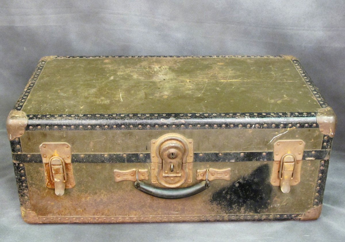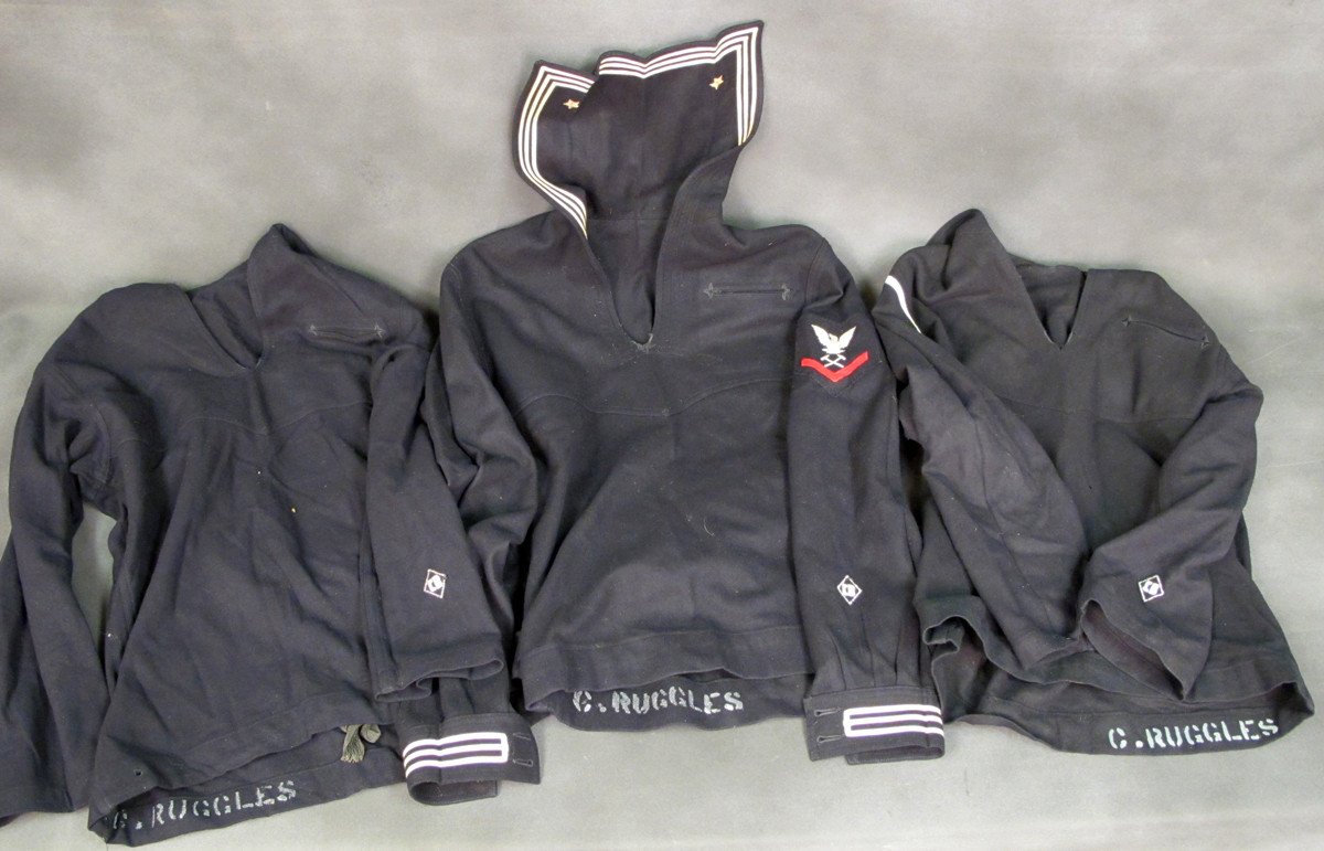 This is a complete footlocker of Seaman "C. RUGGLES" complete with his WWII uniforms, underwear toiletry bag, caps, and even his swimming trunks! The railway receipt indicates that Claude Ruggles came from West Virginia. Maybe a relative of the pre war Movie actor Charlie Ruggles?
