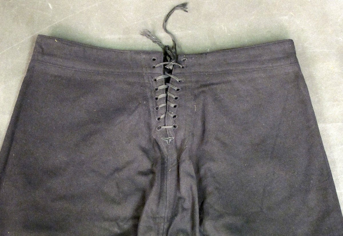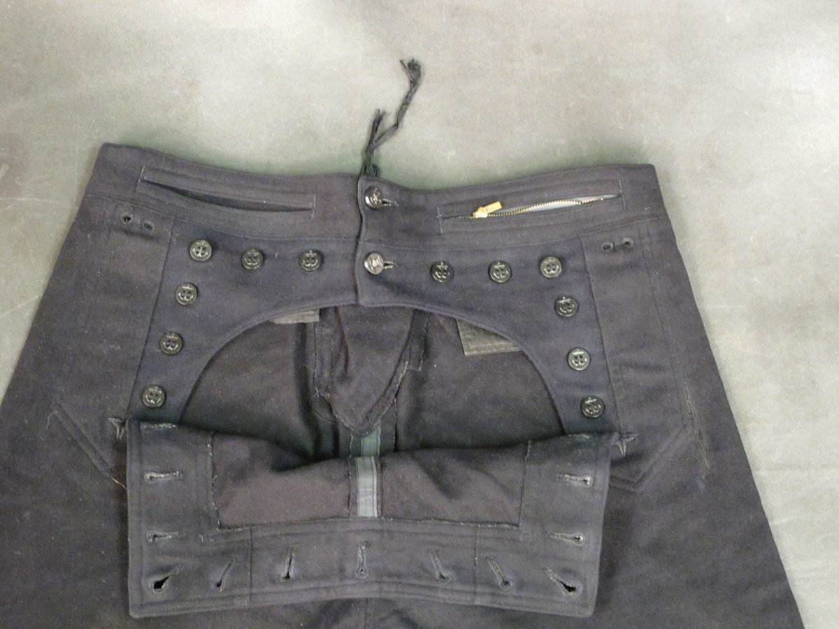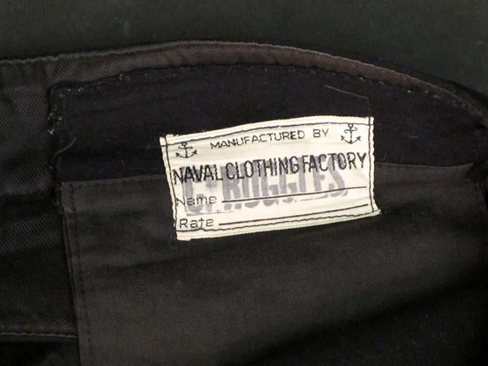 A set of navy blue wool issue trousers, marked C. Ruggles.