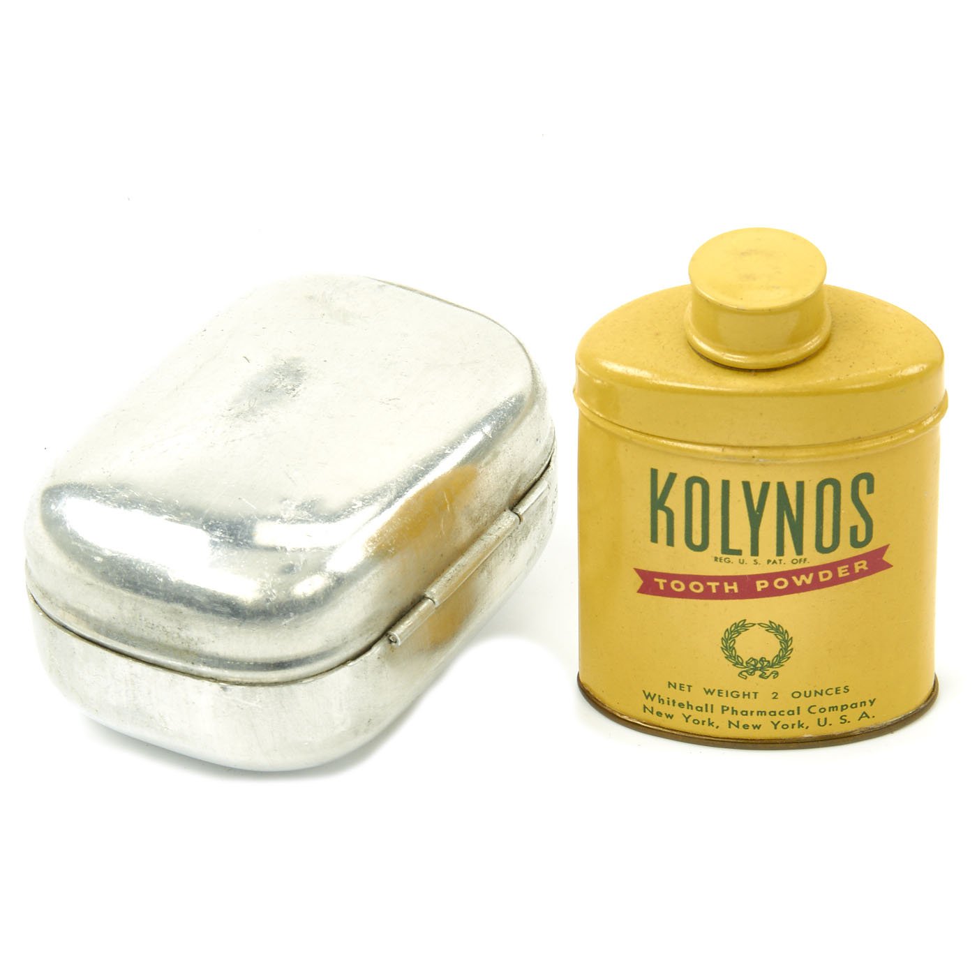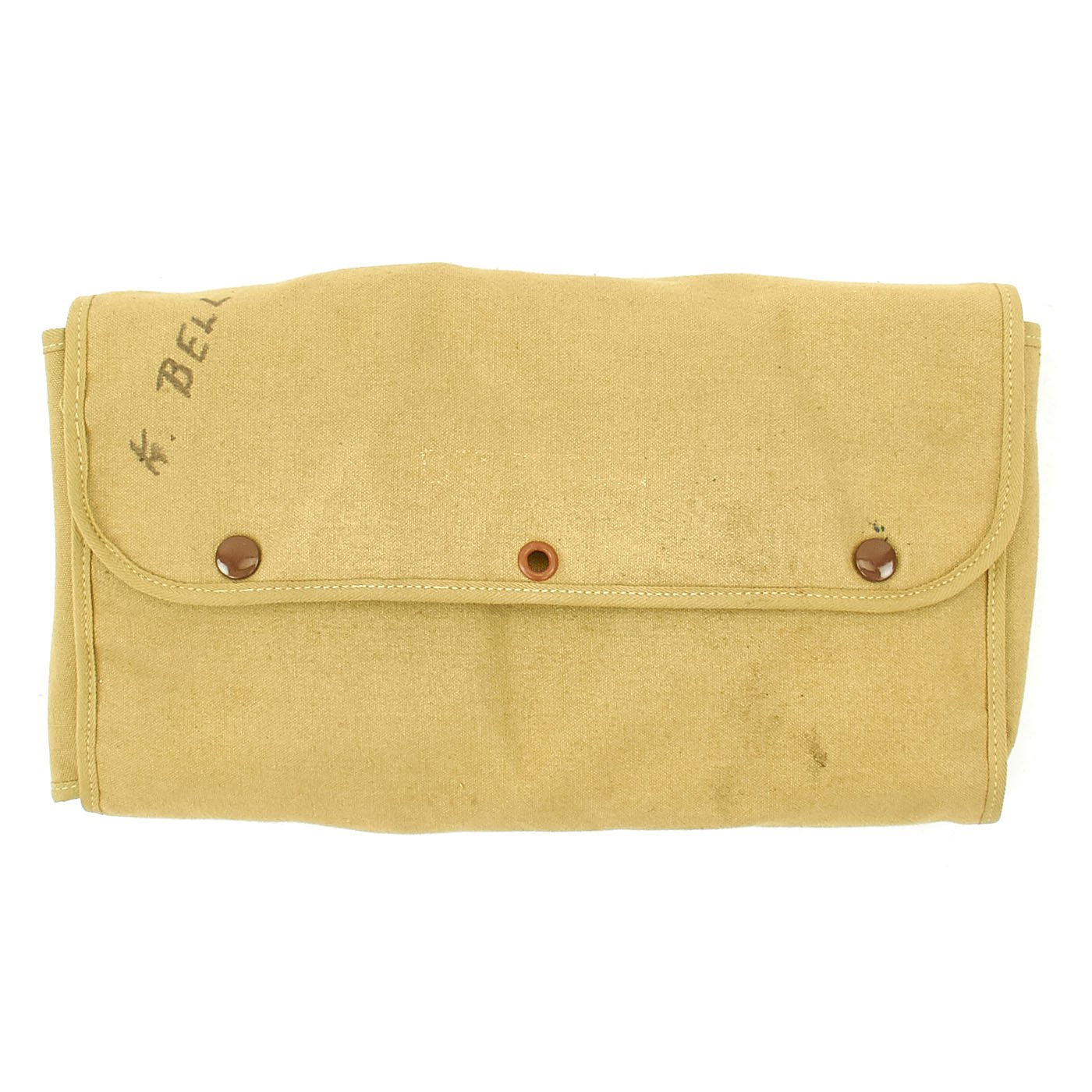 Original Item: Only One Available. The is a Unites States Second World War private purchase Officer toiletry kit names to Lieutenant K. Bell both in ink and in faded gold block lettering across the front. It contains what appears to be unused genuine WW2 (perhaps some postwar) items as follows:
