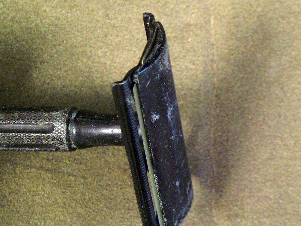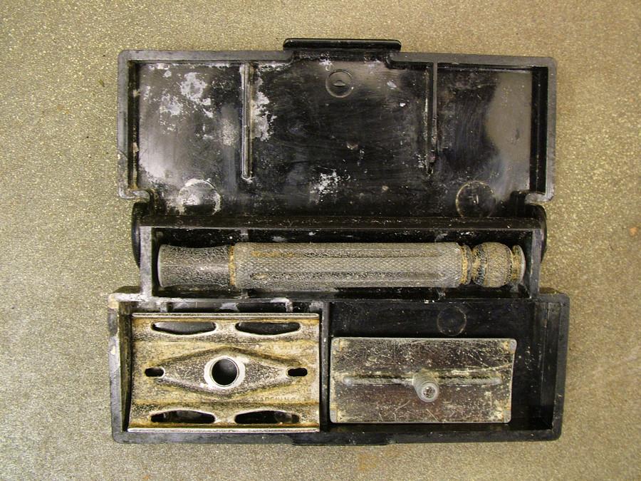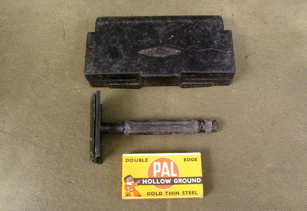 The Razor- Original Item: After World War Two personal items issued to individual solders were usually taken home when the soldier was mustered out. As a result, very few of these items became available to the collector. IMA has found a small quantity of un-issued US issue Gillette safety razors in the original hinged Bakelite plastic case. The case is marked with the Gillette arrow logo in a diamond. Inside the case is a safety razor handle and head with extra space for a supply of double-edged blades. The end of the razor is either marked "MADE IN U.S.A." Or "MADE IN ENGLAND" (no choice) along with the Gillette logo as found on the case. This is a very rare accessory, as the troops took them home when they left the service. Now you can complete your re-enactor gear with this genuine accessory. Also see our original US issue shaving brush.