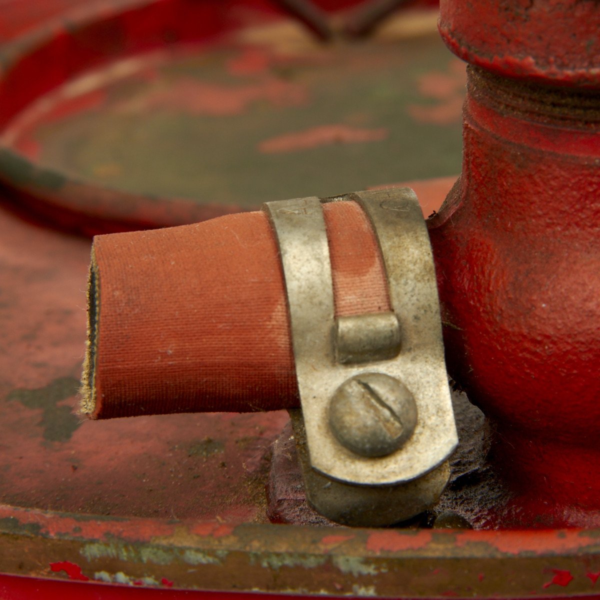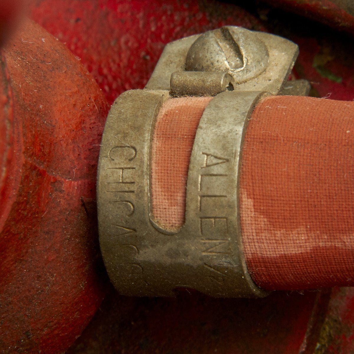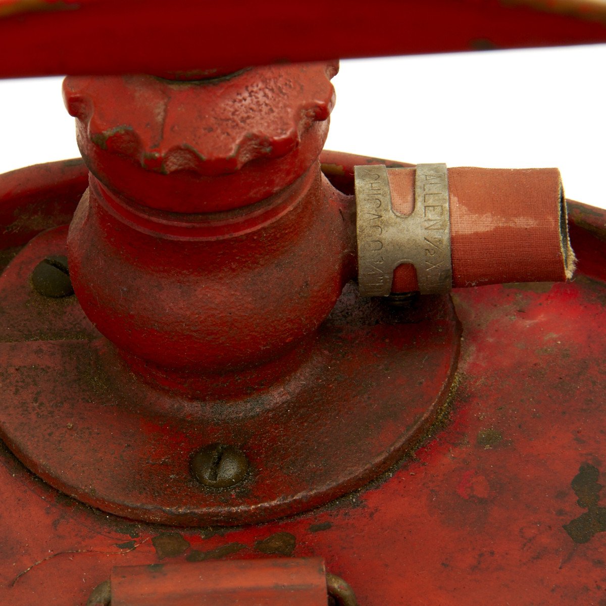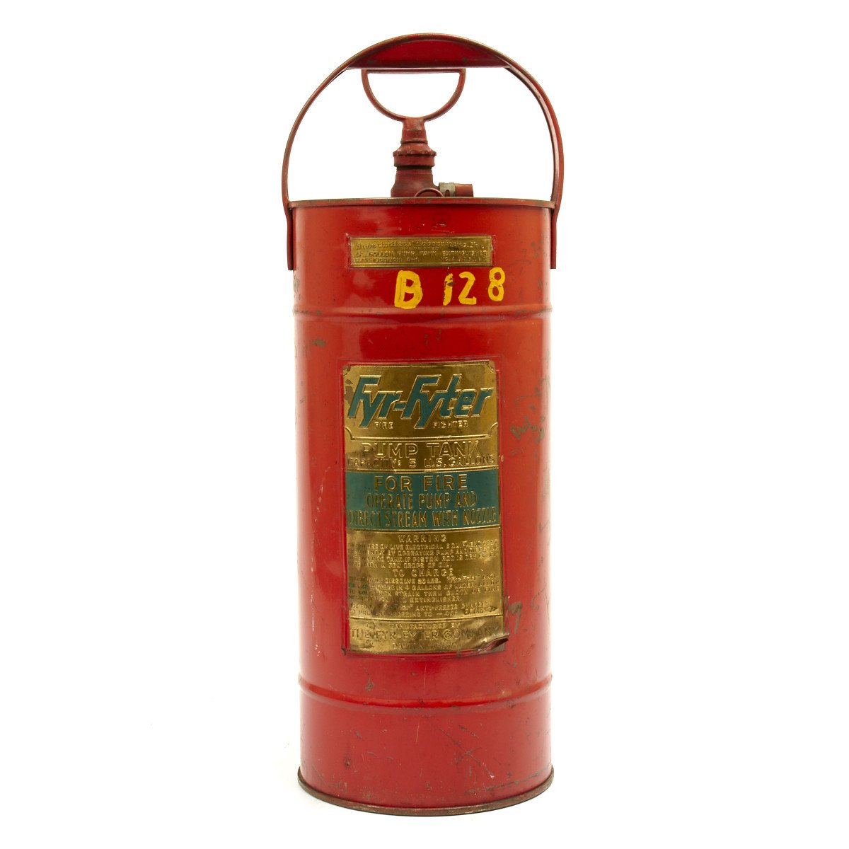 Original Item: Only One Available. This was found in collection of B-17 material released by the Collins Foundation. It is a 1930s FYR FYTER COMPANY of Dayton Ohio 5 gallon pump tank extinguisher with cherry red paint and brass data plates. The pump handle still functions though the spray hose has been cut and removed. This is the style extinguisher used on Army Air Force Airfields in England during WWII by the ground support crews for B-17s and other planes. Offered in very good condition.