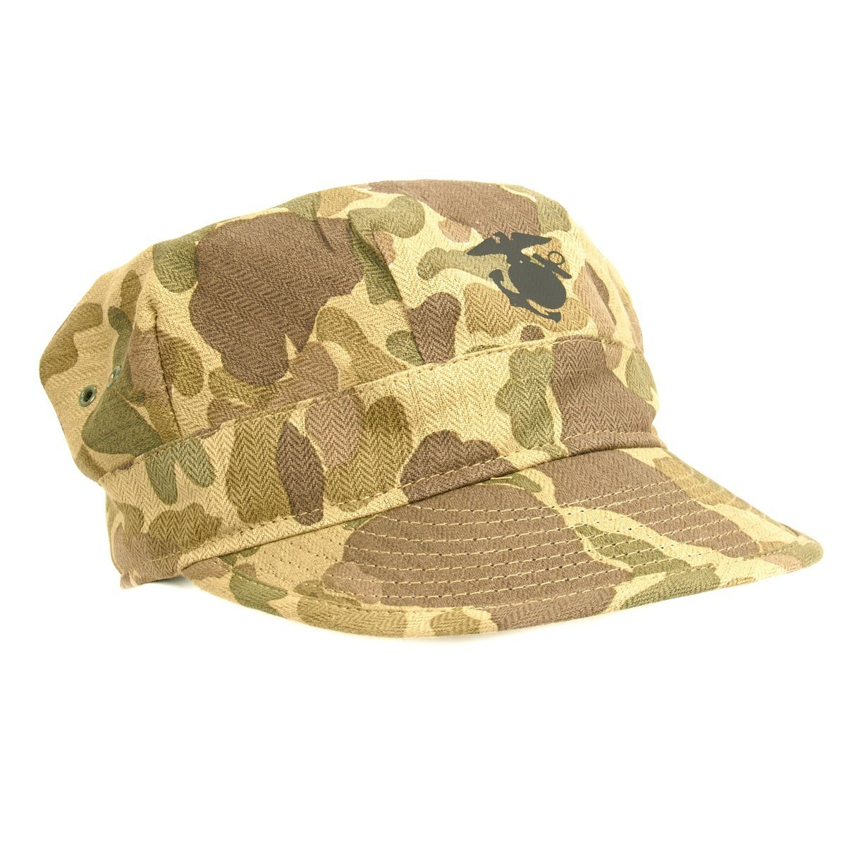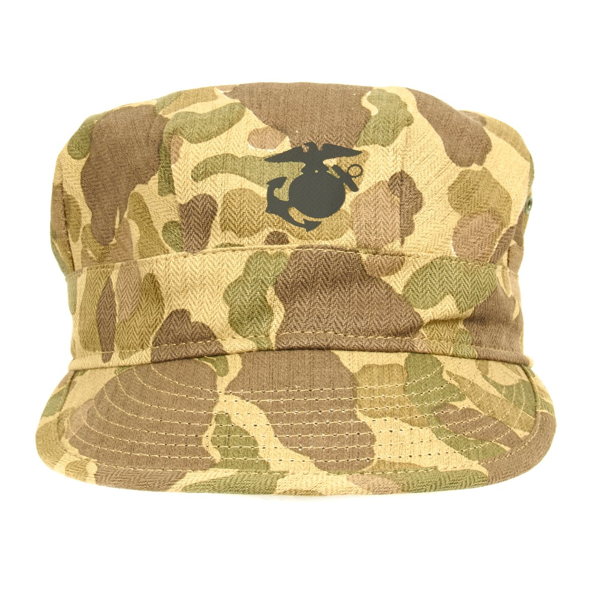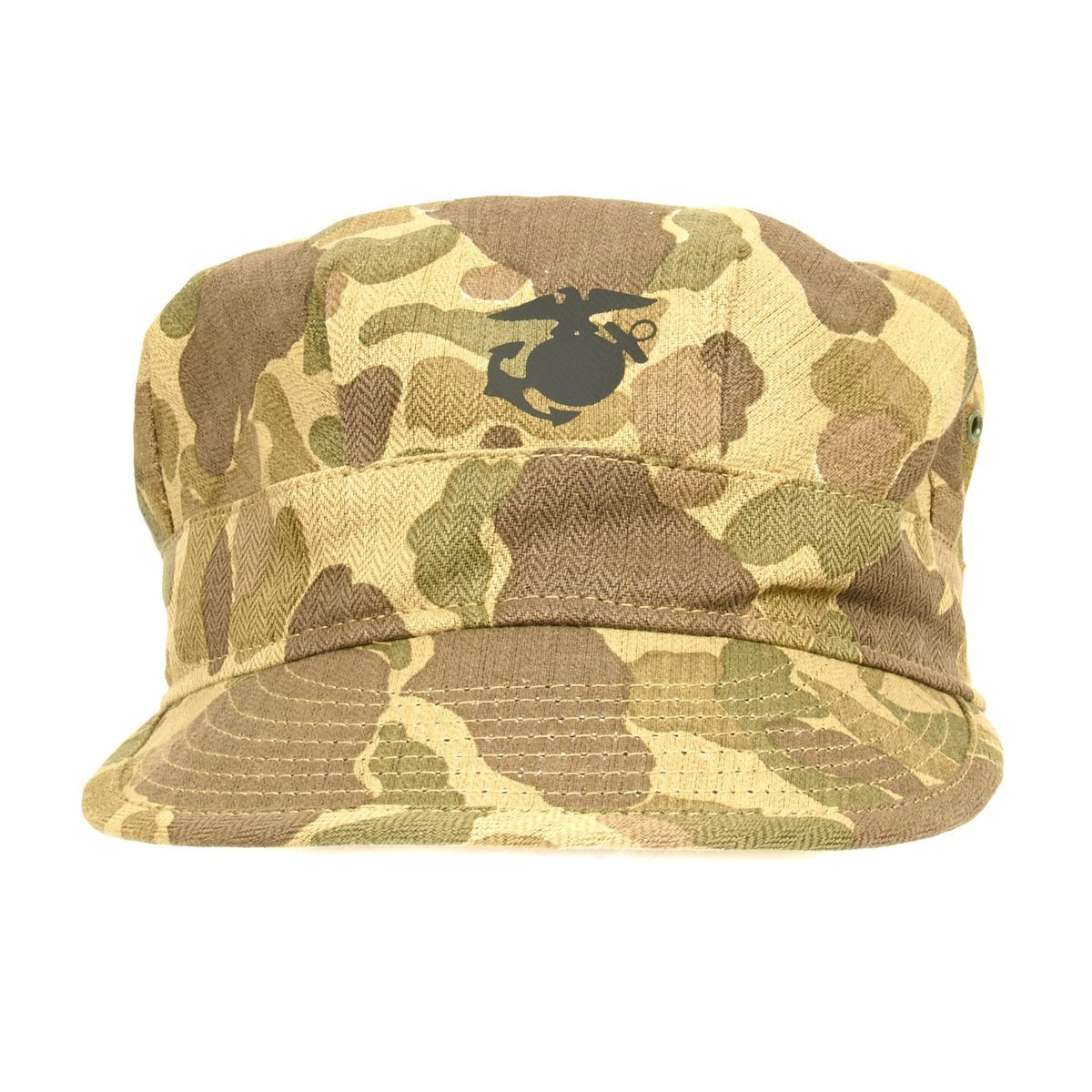 New Made Item: A fantastic reproduction WWII P44 cap or cover in USMC Jungle Camouflage. Constructed of heavy cotton Herring Bone Twill with Black EGA. World War II style U.S. Marine Corps P-44 Utility Cap, yes we know that real Marines refer to this as a cover! Please note that these do not have a separate top piece like current 8-point utility covers. Sizes tend to run a little large.