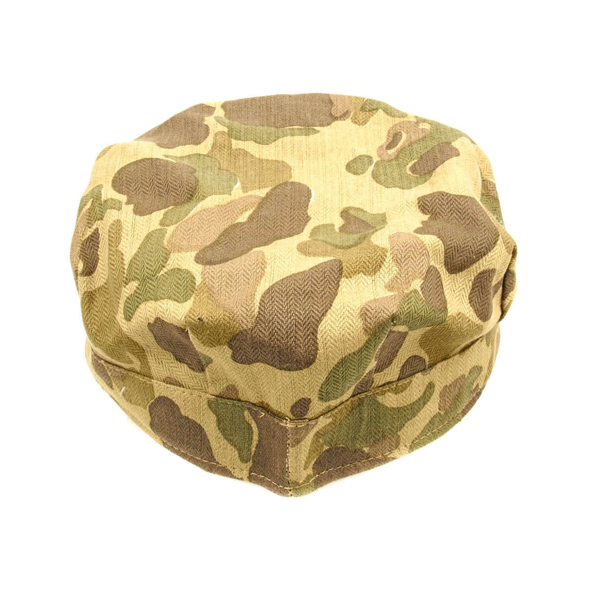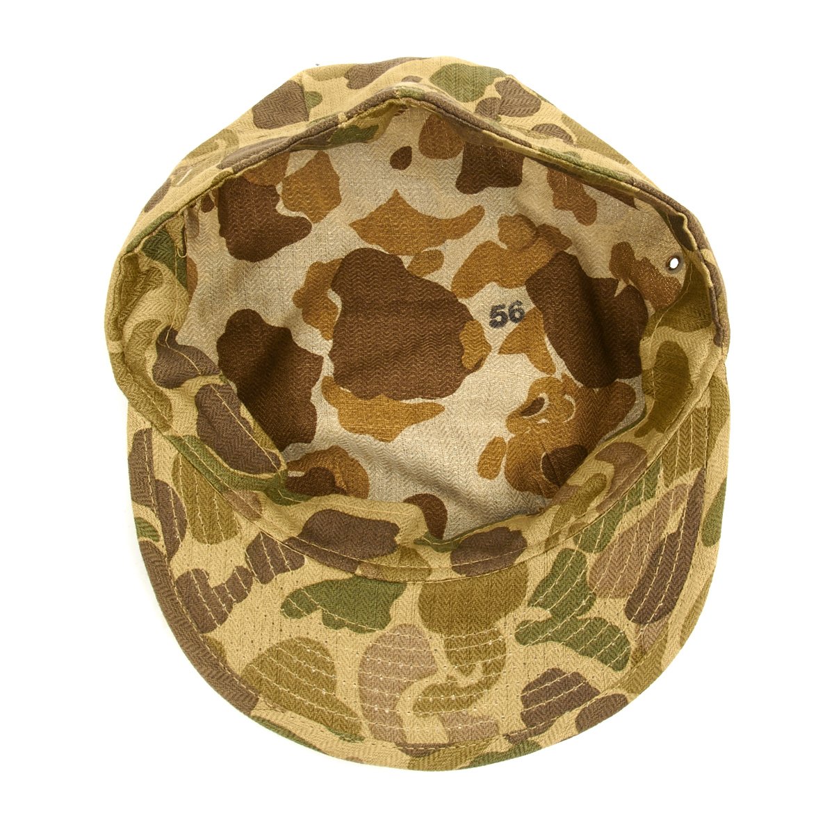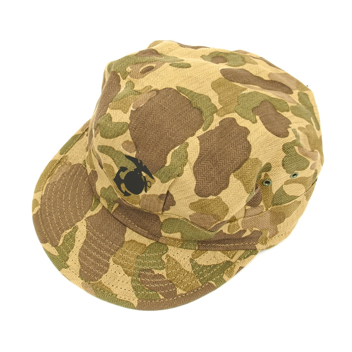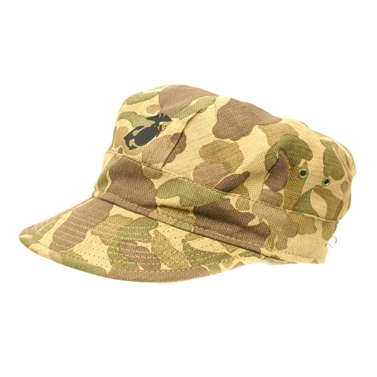 New Made Item: A fantastic reproduction WWII P44 cap or cover in USMC Jungle Camouflage. Constructed of heavy cotton Herring Bone Twill with Black EGA. World War II style U.S. Marine Corps P-44 Utility Cap, yes we know that real Marines refer to this as a cover! Please note that these do not have a separate top piece like current 8-point utility covers. Sizes tend to run a little large.