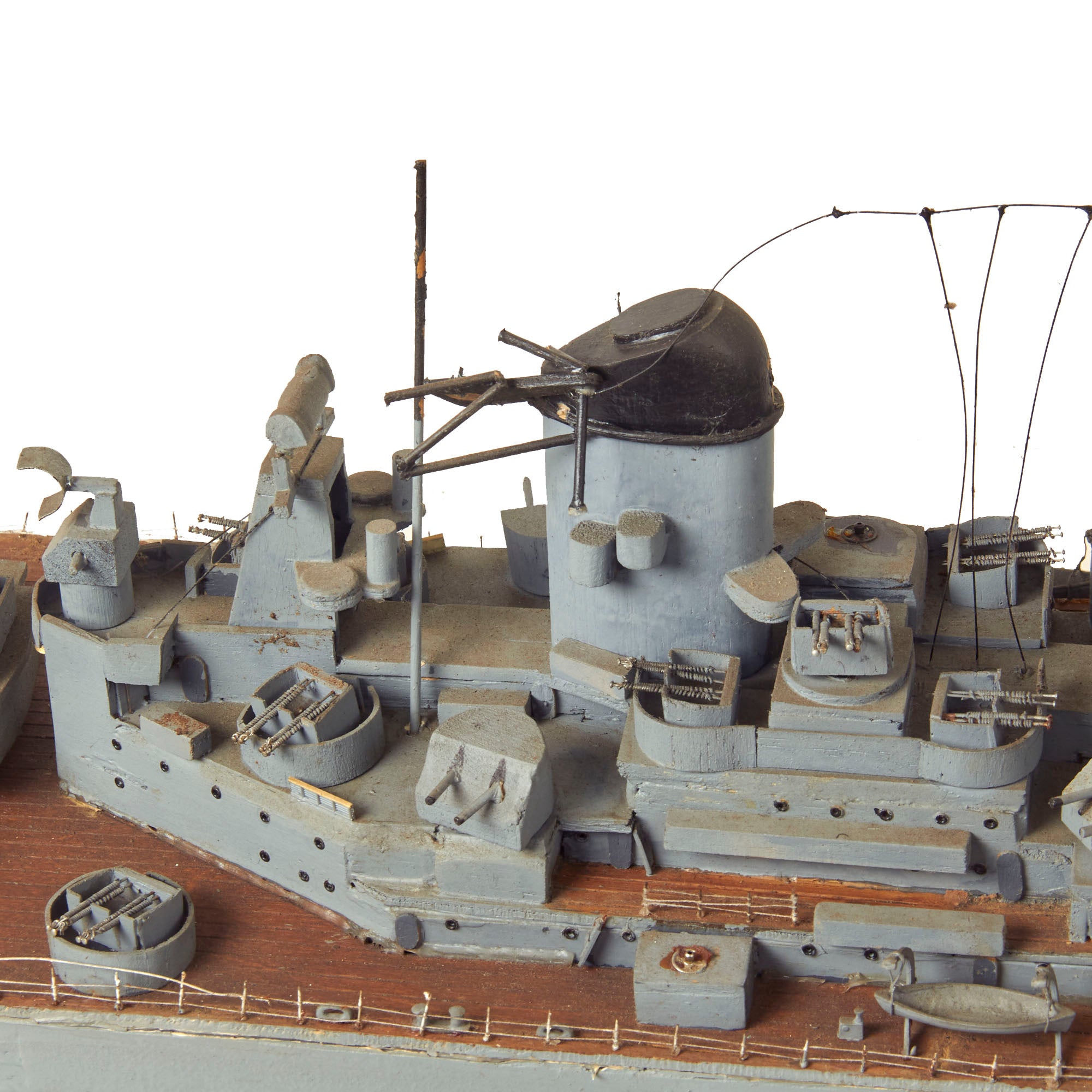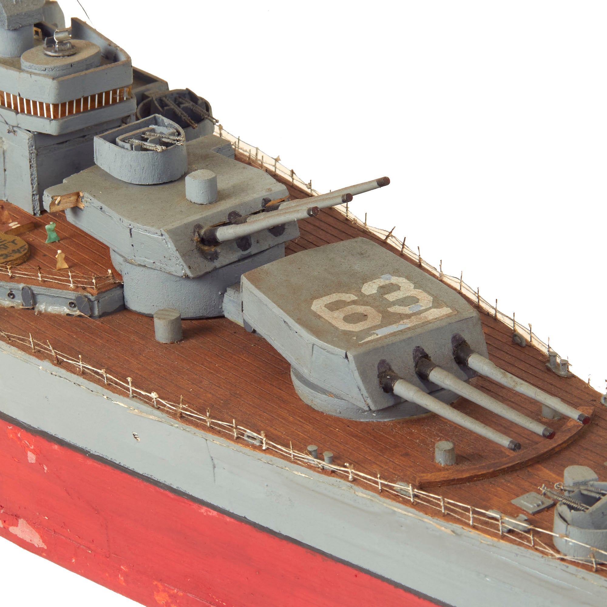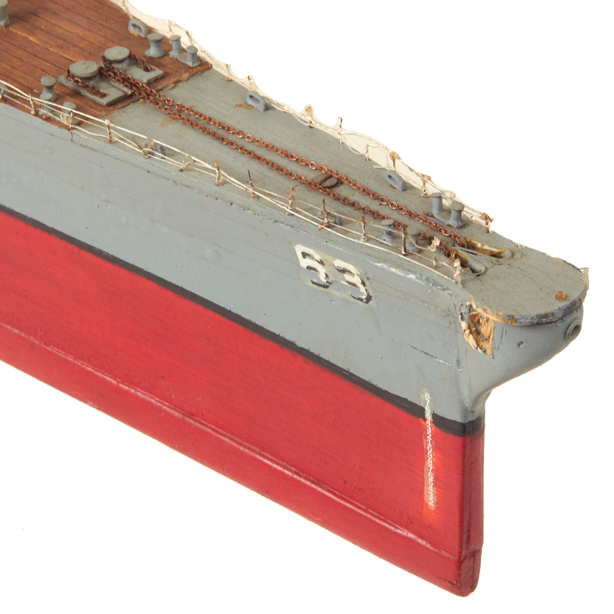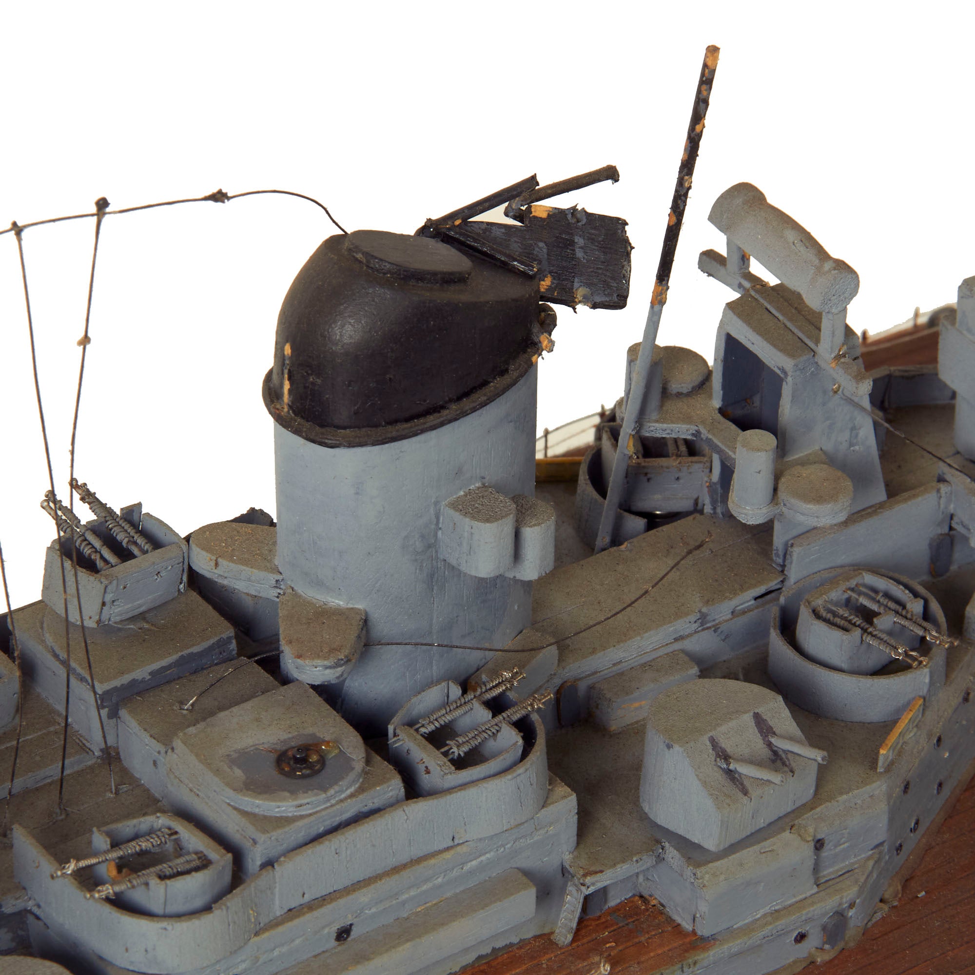 One-of-a-kind. This is an incredibly detailed gorgeous custom built 1:200 scale wood model. We believe it dates from he late 1980s and was not assembled from a kit. It measures approximately 56" L x 8" W x 11" H. The boat weighs approximately 20 lbs. It is constructed of wood with some plastic and metal fittings. It was originally designed to be a RC (radio controlled0 watercraft as the props and rudders are connected to internal. Overall condition is very good but a few small parts have broken off and are missing or have been glued back on.