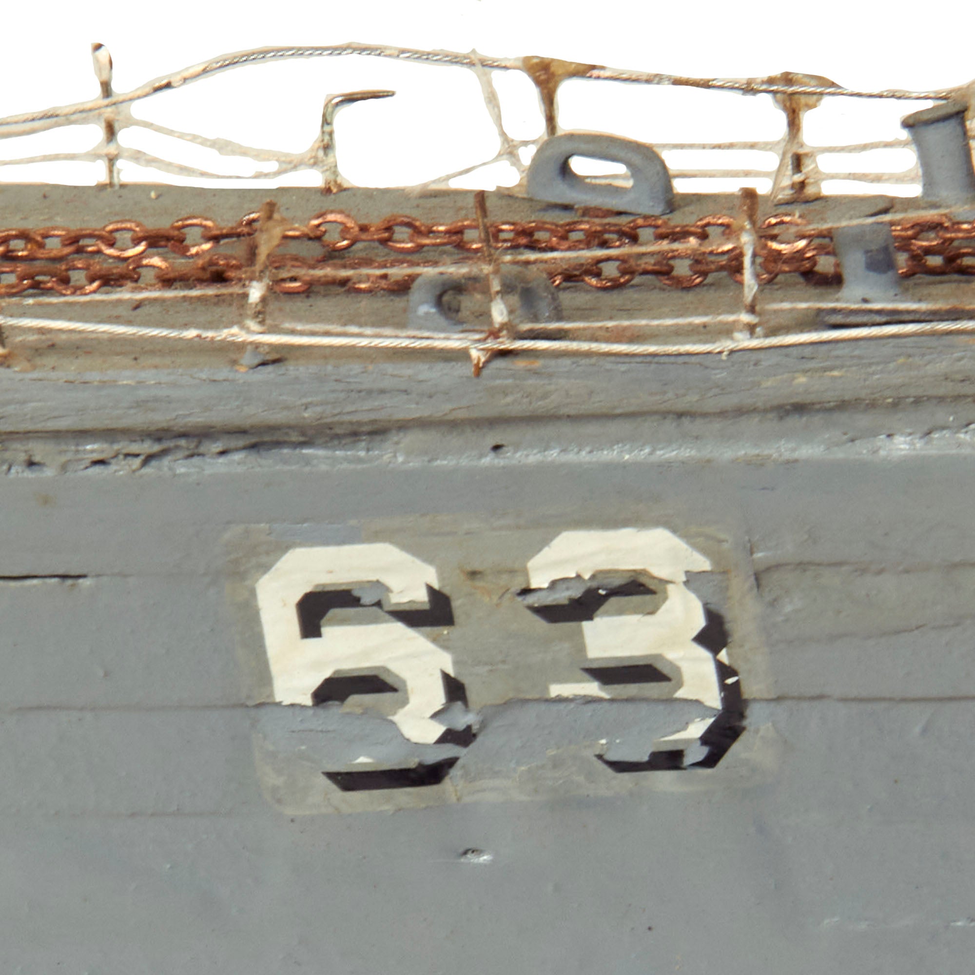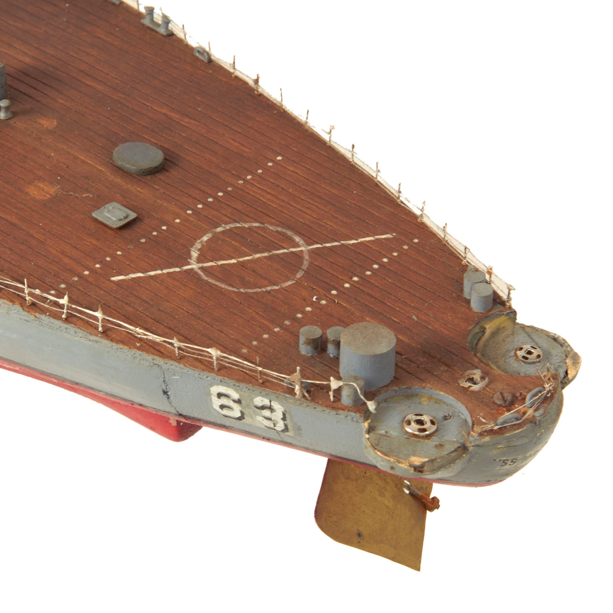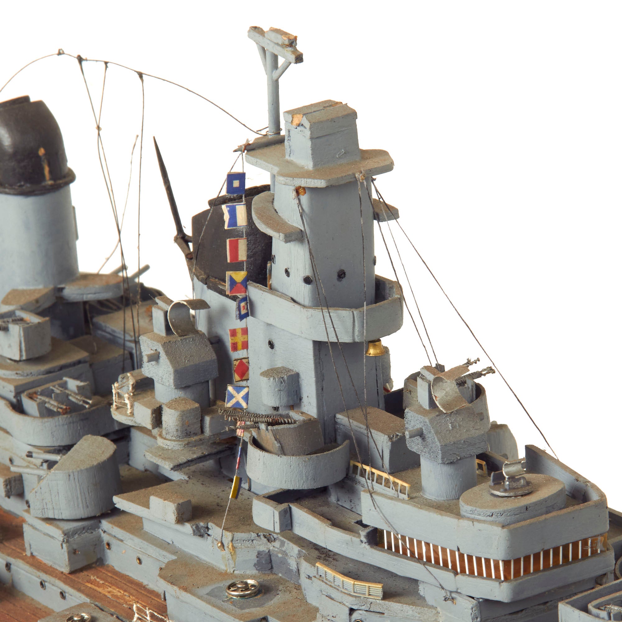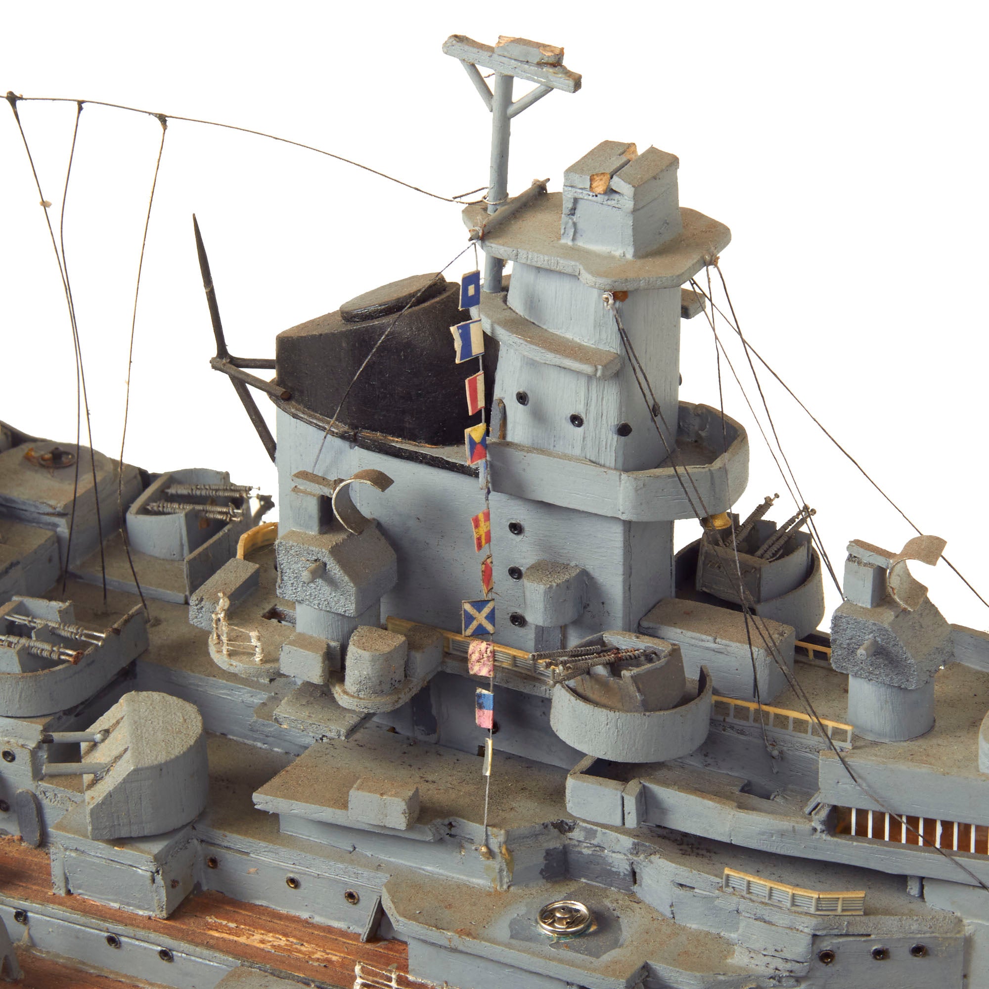 One-of-a-kind. This is an incredibly detailed gorgeous custom built 1:200 scale wood model. We believe it dates from he late 1980s and was not assembled from a kit. It measures approximately 56" L x 8" W x 11" H. The boat weighs approximately 20 lbs. It is constructed of wood with some plastic and metal fittings. It was originally designed to be a RC (radio controlled0 watercraft as the props and rudders are connected to internal. Overall condition is very good but a few small parts have broken off and are missing or have been glued back on.