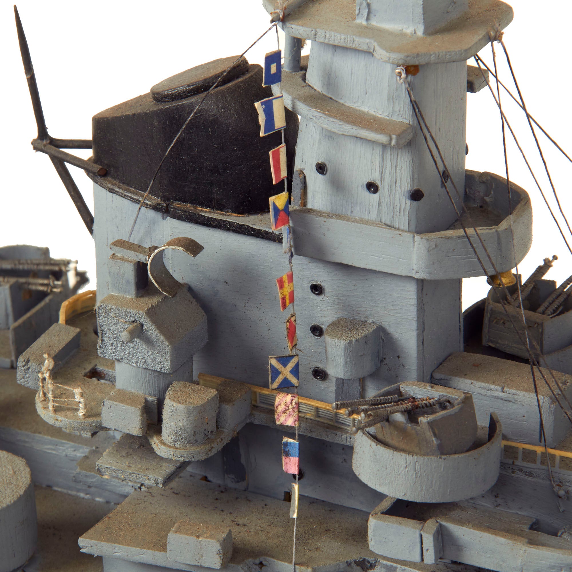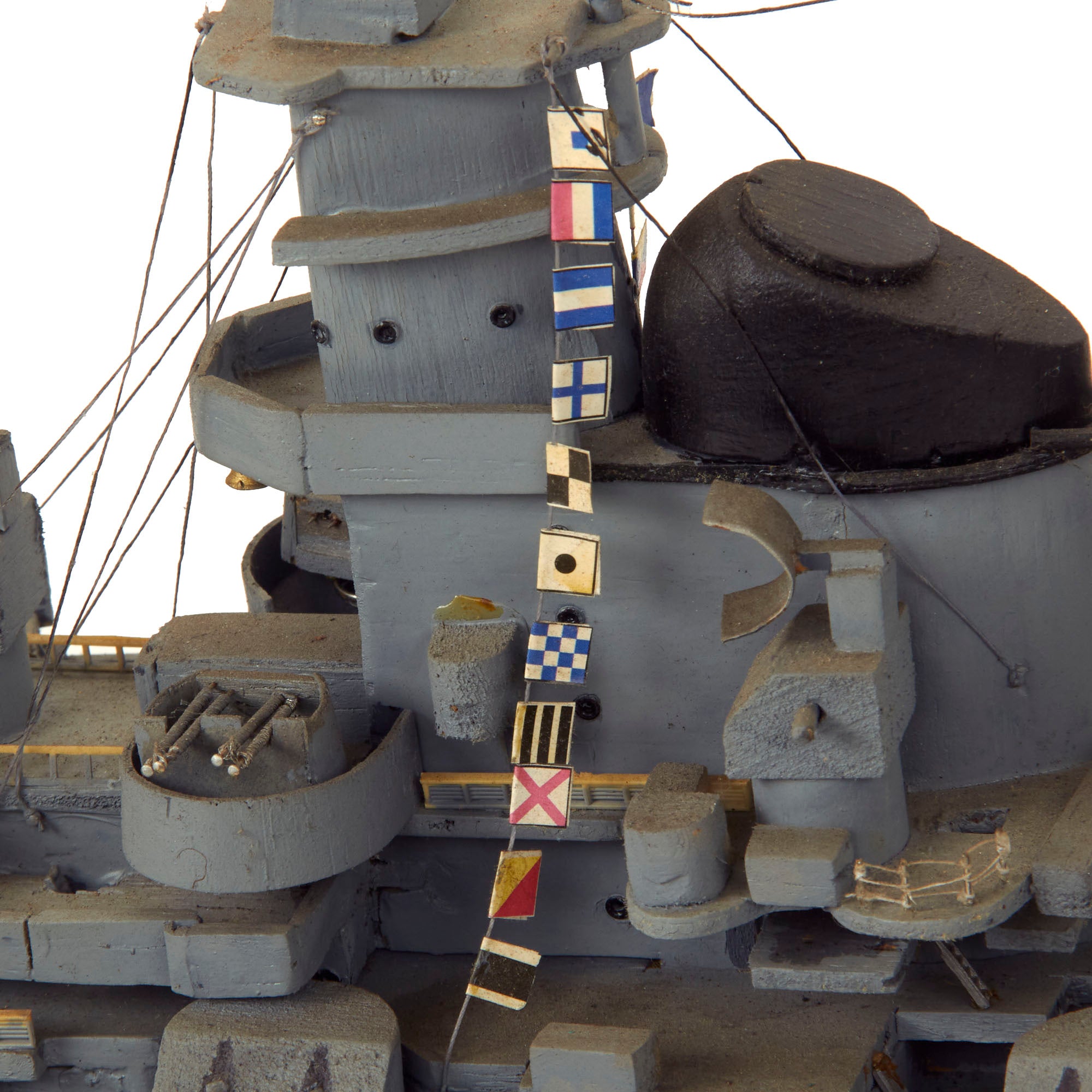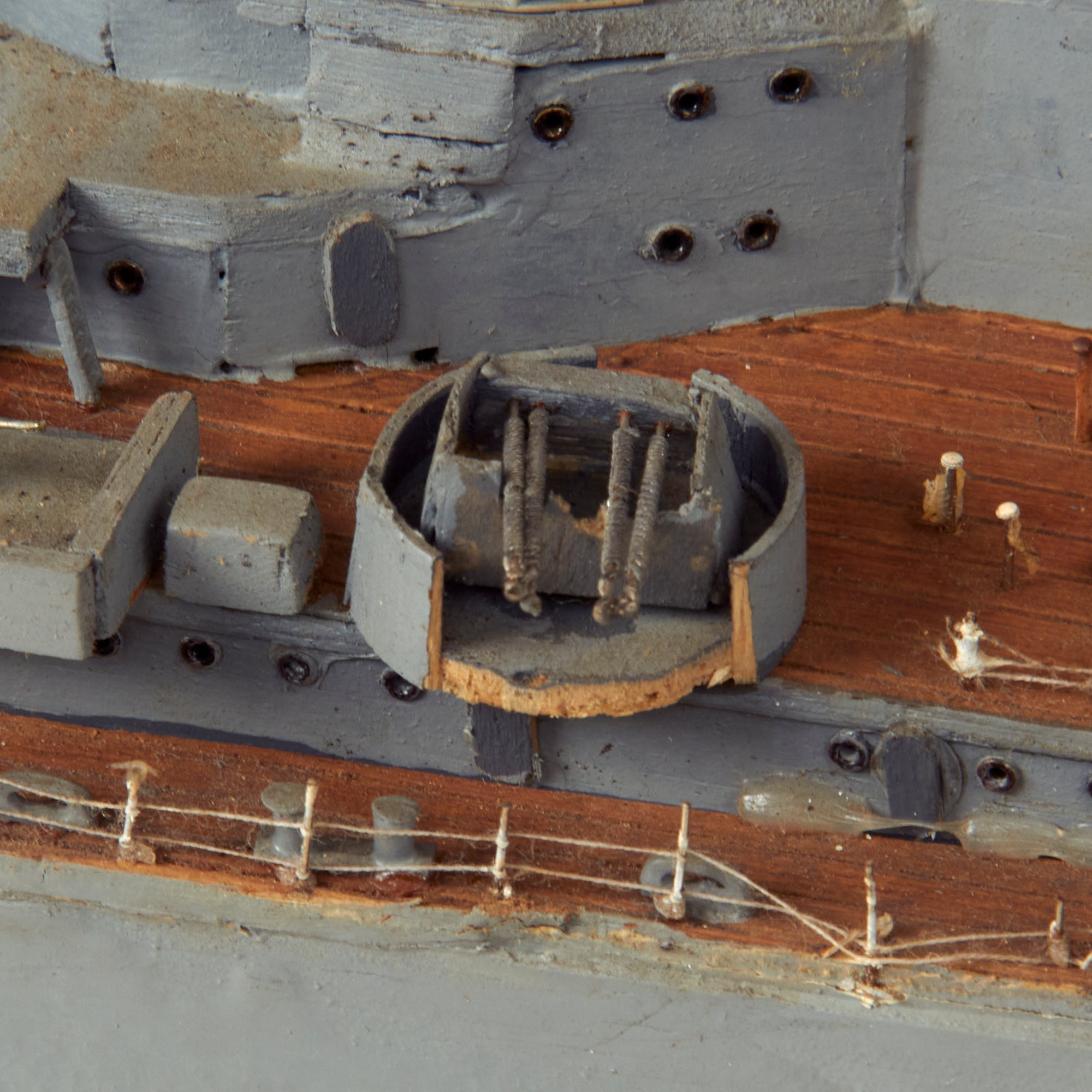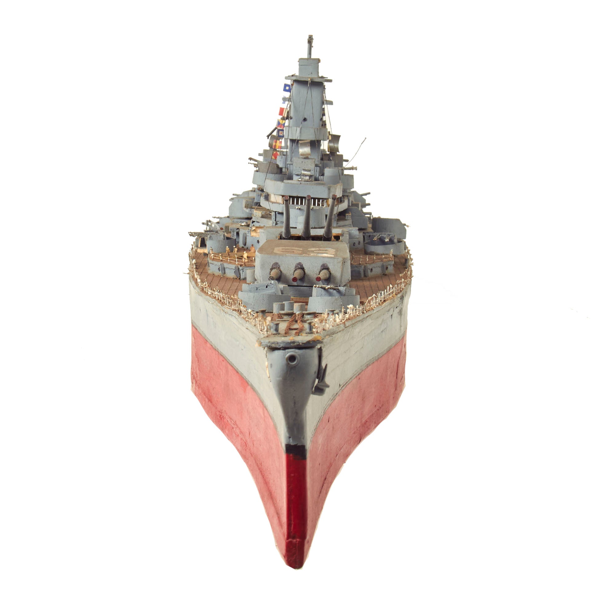 One-of-a-kind. This is an incredibly detailed gorgeous custom built 1:200 scale wood model. We believe it dates from he late 1980s and was not assembled from a kit. It measures approximately 56" L x 8" W x 11" H. The boat weighs approximately 20 lbs. It is constructed of wood with some plastic and metal fittings. It was originally designed to be a RC (radio controlled0 watercraft as the props and rudders are connected to internal. Overall condition is very good but a few small parts have broken off and are missing or have been glued back on.