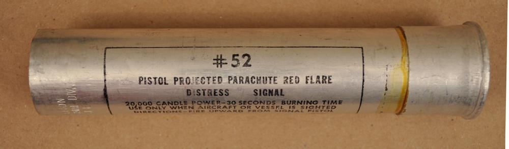 Original Item: The US nomenclature is #52 PISTOL PROJECTED PARACHUTE RED FLARE DISTRESS SIGNAL. This was the standard ship-board signal of World War Two. The flare cartridge is 7.25 inches (185 mm) long. It is fired from a long-barreled 37-mm signal pistol. The long barrel was required for the proper functioning of the flare cartridge. Very scarce. Not guaranteed to ignite.