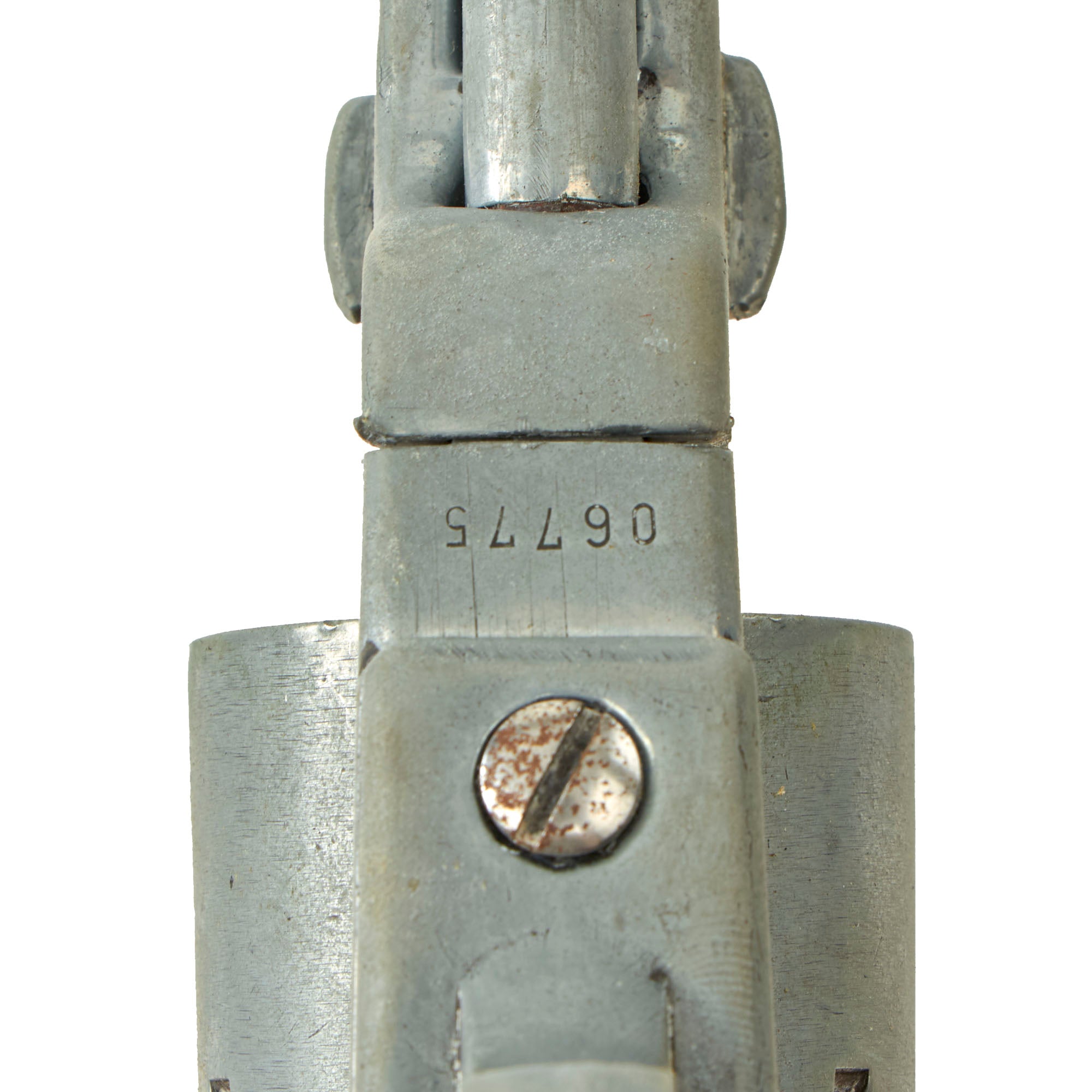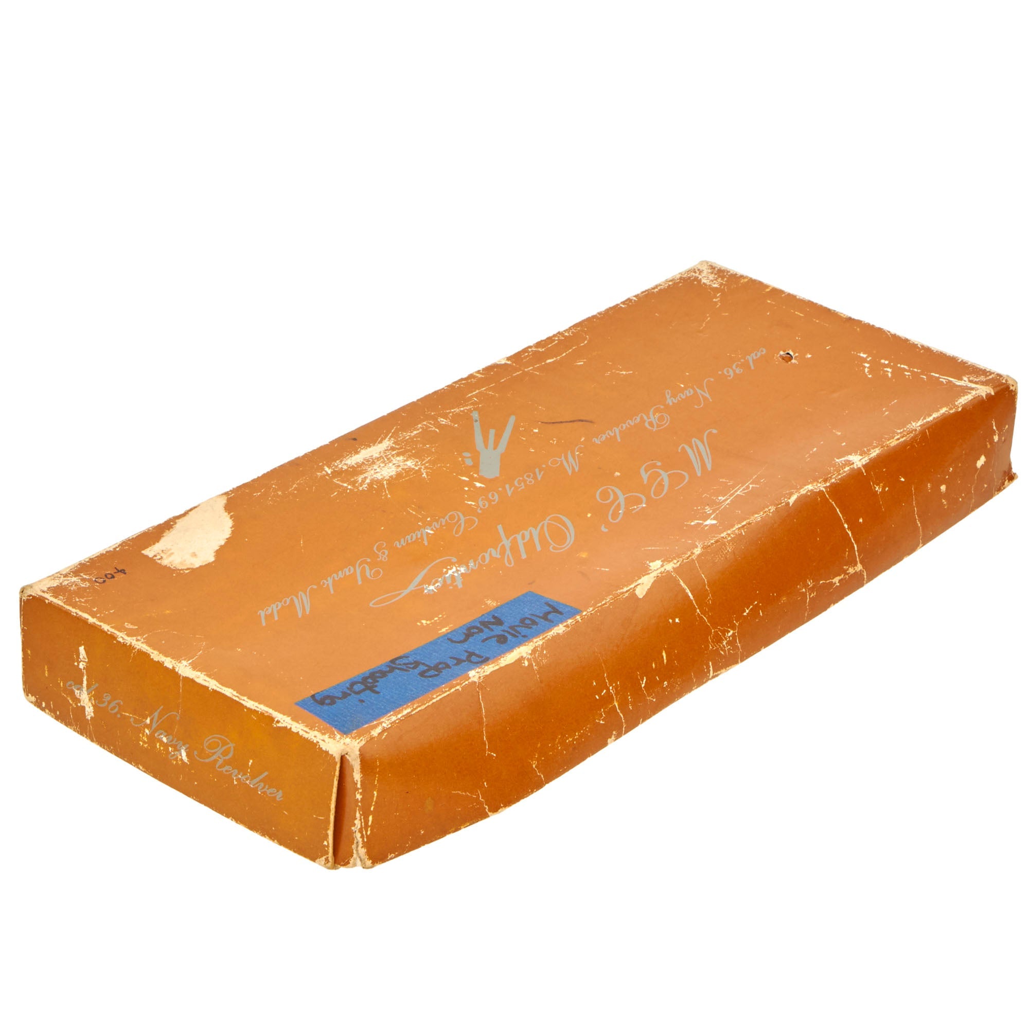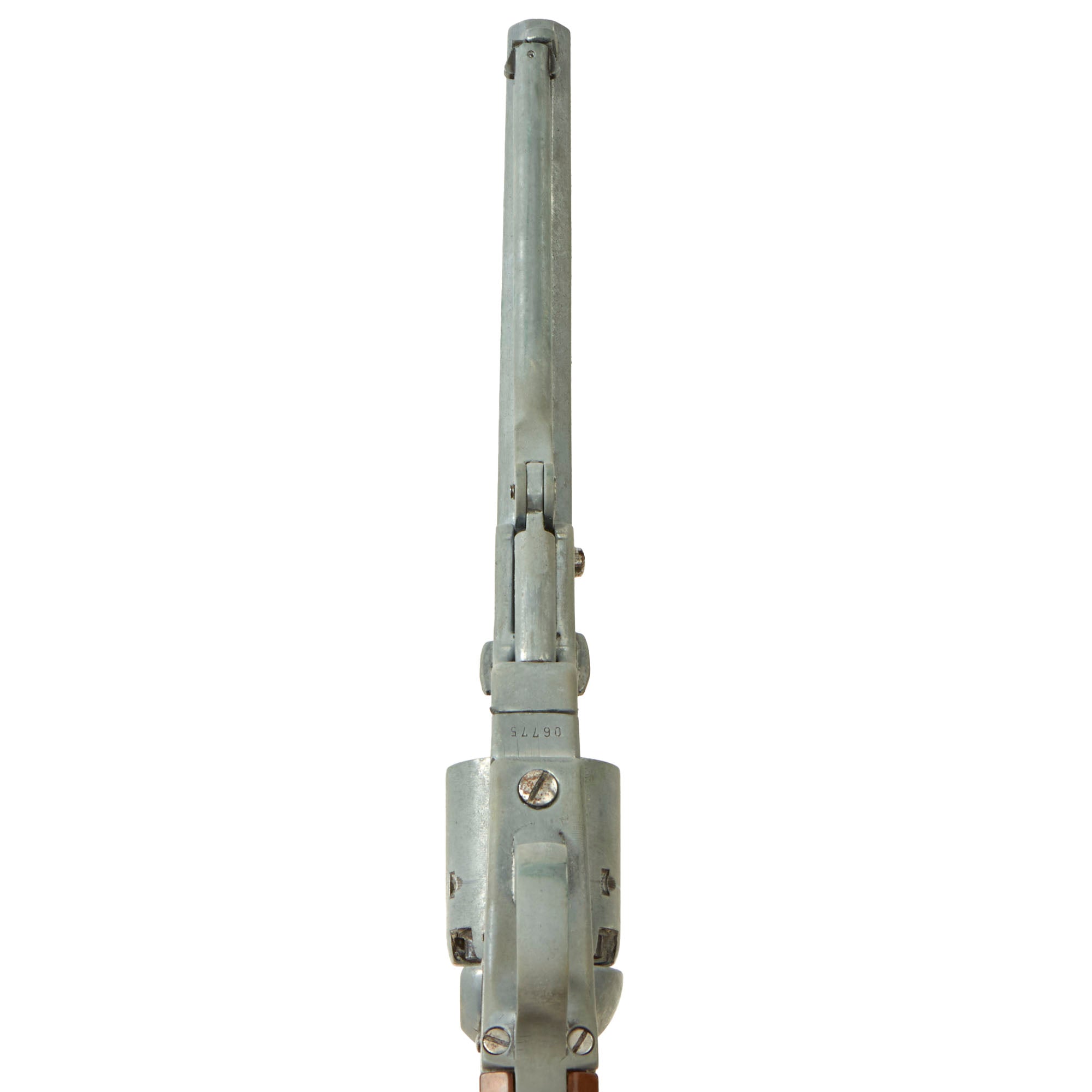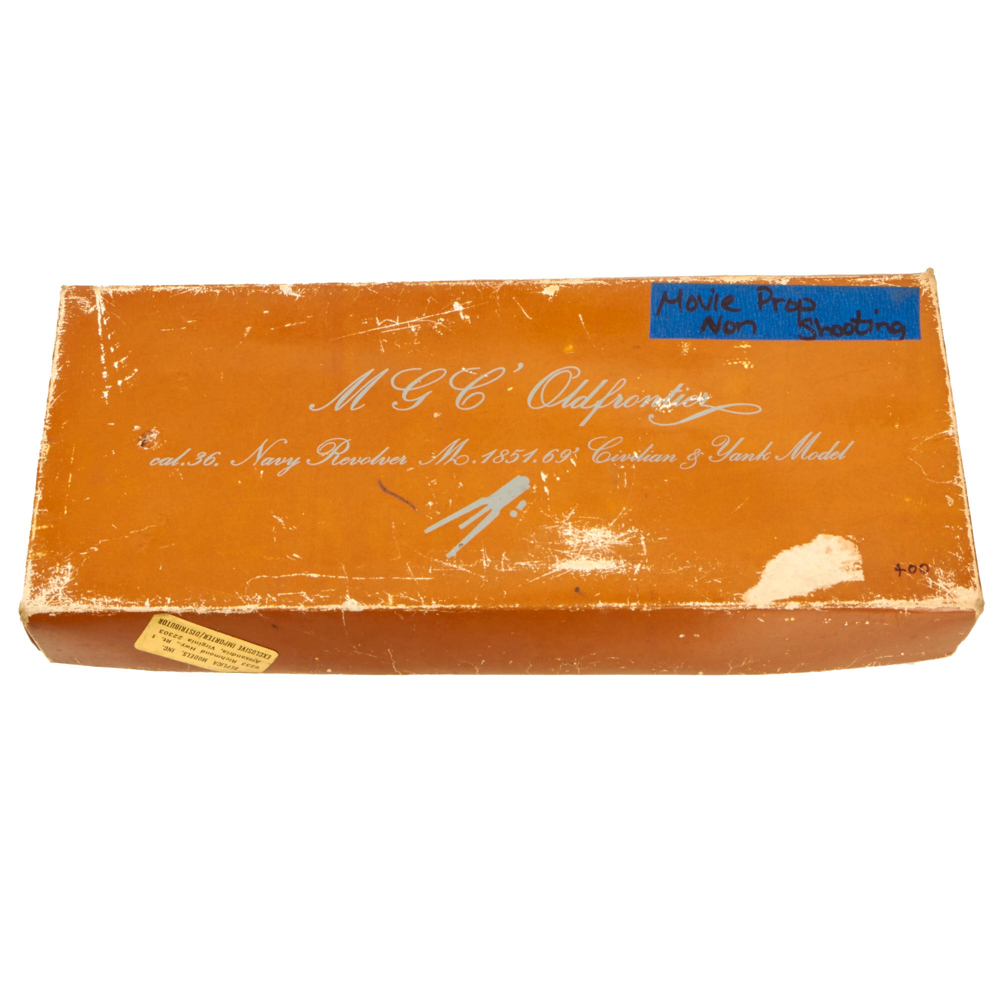 The box reads MGC Oldfrontier cal.35. Navy Revolver M.1851-69’ Civilian & Yank Model. There is a sticker on the side of the box for the distribution company. There is a label on the front of the box reading MOVIE PROP NON SHOOTING, suggesting that this may have been used in a film at some point. The box measures 5½" x 13½". Under the revolver is a stack of some paperwork including warnings about it being for display purposes only and cannot be disassembled. Despite the cocking handle and cylinder being usable, the cylinder’s barrels are partially filled in, so this can never be converted to be fired, and is for display purposes only. There’s also an folded catalog of other toy pistols offered by the company. The revolver has the serial number 06775.