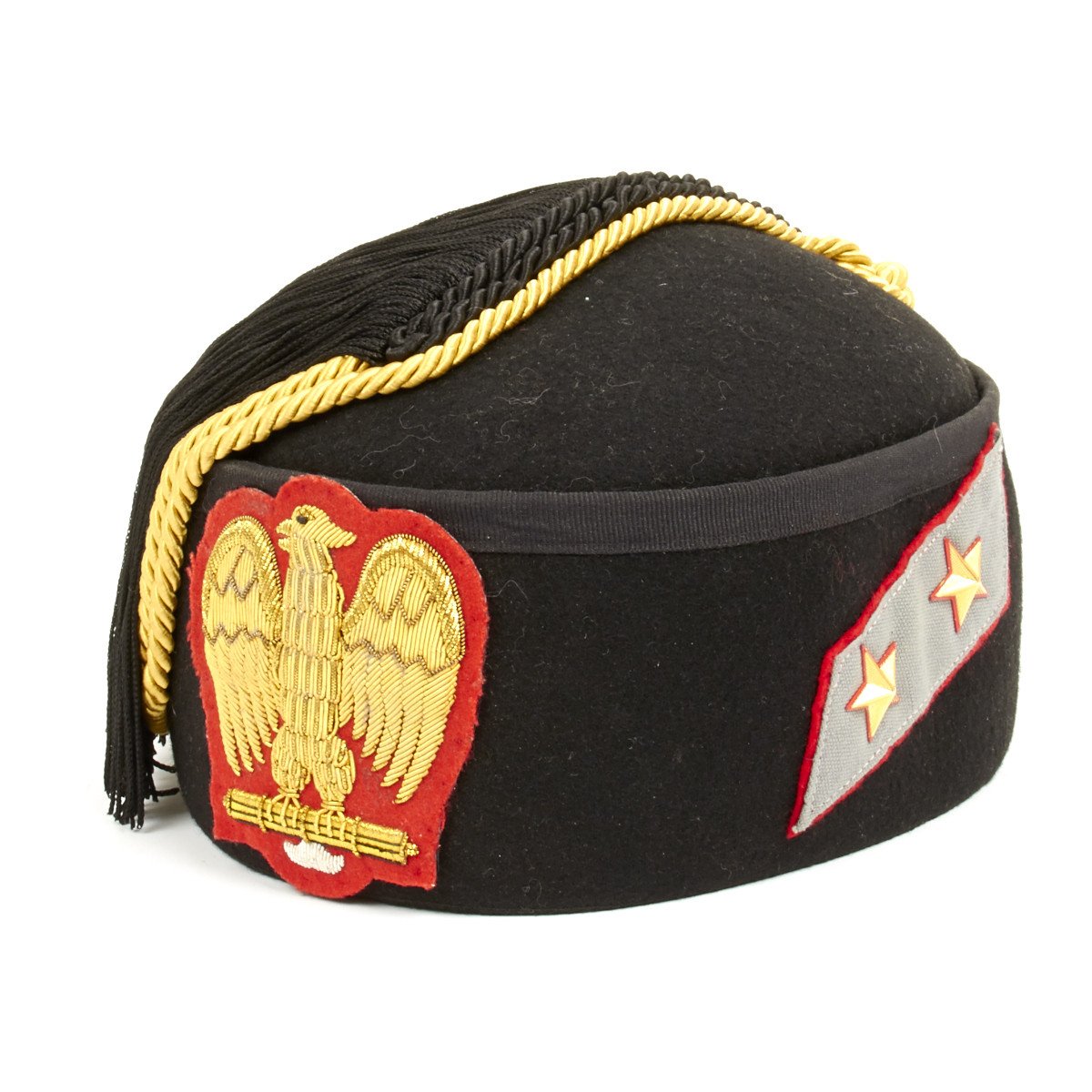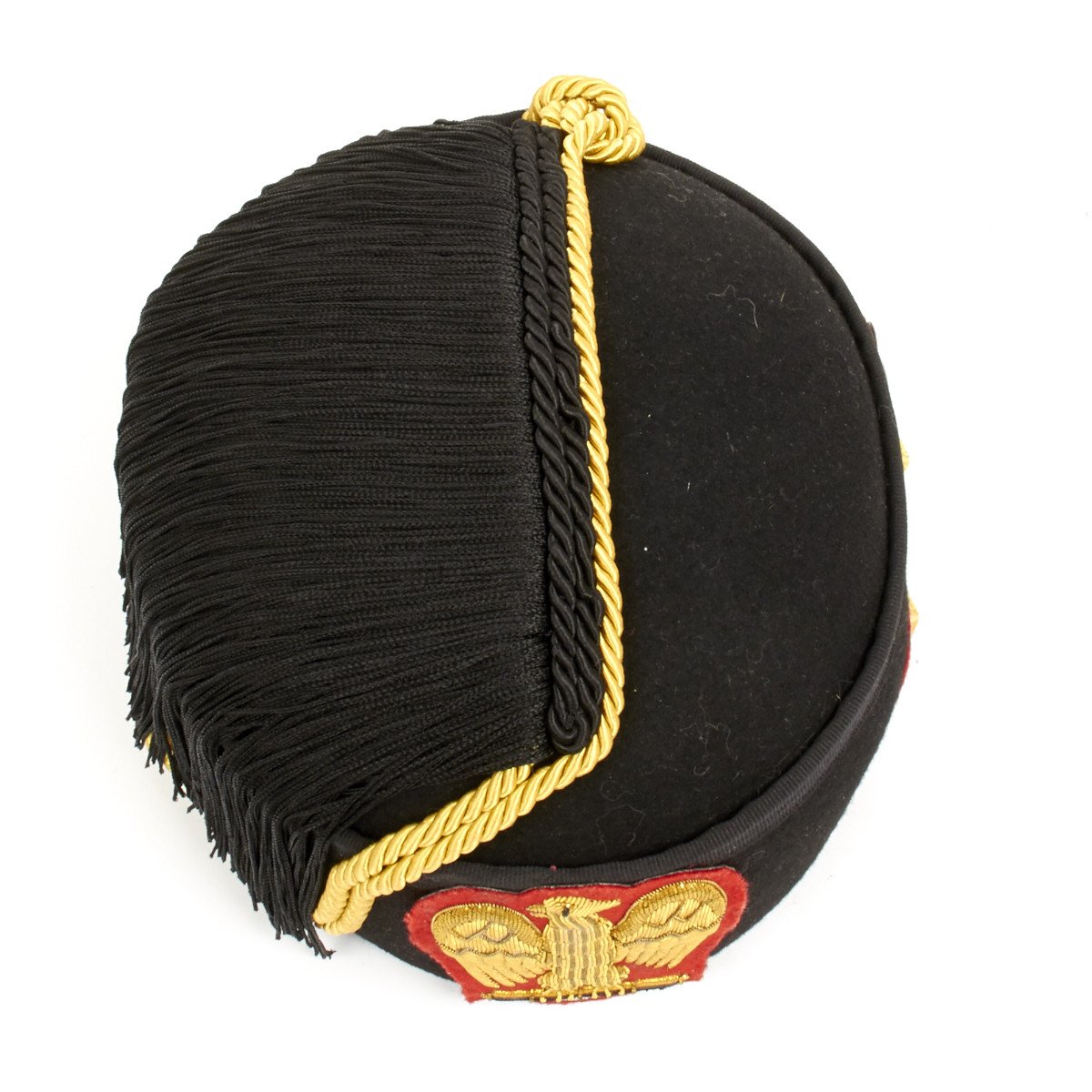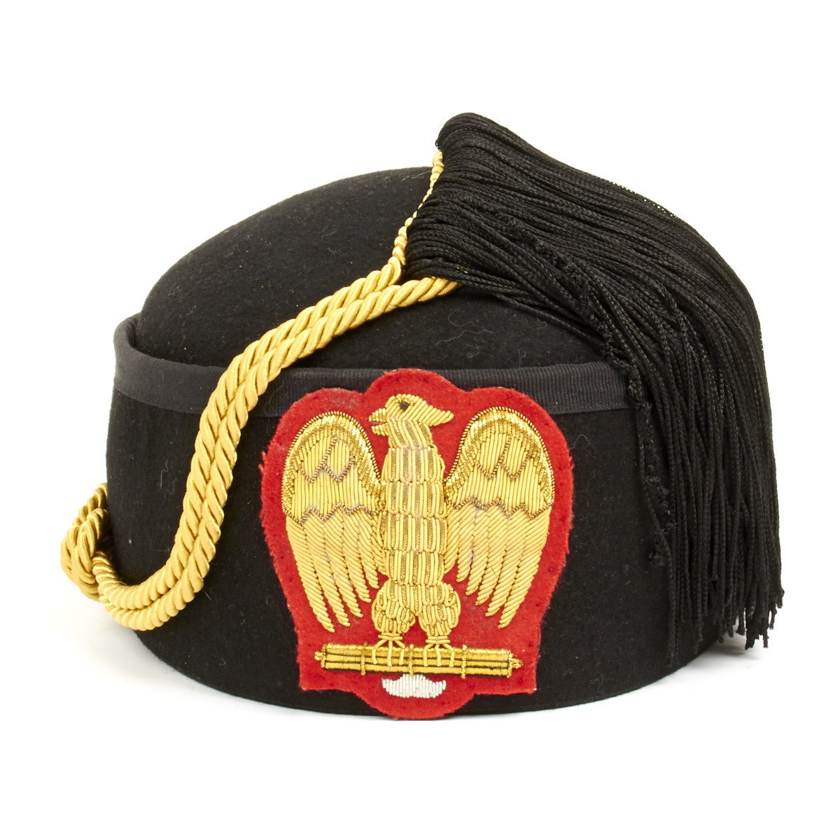 This excellent condition fez features a gold bullion embroidered eagle symbol to front, gold rope braid and two stars to the left side. It is approximately size 59 cm (7 3/8) and comes complete with long braid tassel. Excellent eye catching item for any WW2 Italian collection.